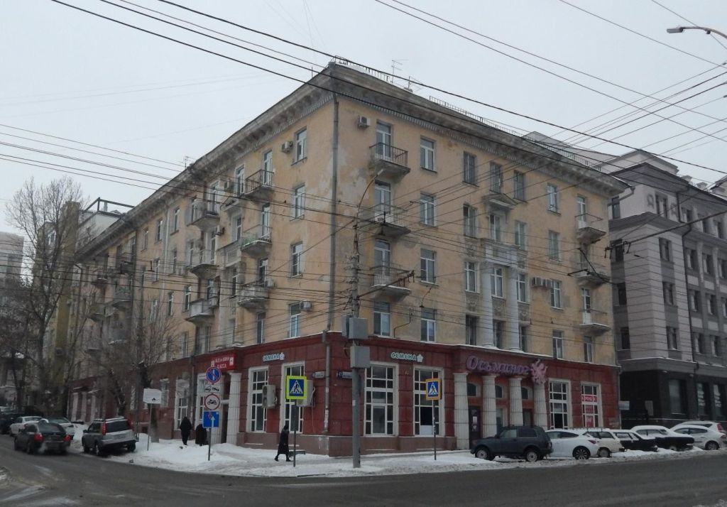 1Градостроительные характеристики:- местоположение в структуре городской застройки - на пересечении ул. Московской и ул. им. Некрасова Н.А.2Объёмно- пространственное композиционное построение здания со всеми фасадами -габариты здания на середину XX в.;-Г- образная форма плана.3Композиционное и архитектурно-художественное оформление фасадов:3.1- северо-восточного фасада по ул.Московской -симметричная относительно центральной оси композиция в семь световых осей;-горизонтальное членение фасада междуэтажнымкарнизом в уровне второго этажа, с выделением нижней части цветом и характером отделки (руст). 3.2- юго-восточного фасада по ул. им. Некрасова Н.А. -асимметричная композиция в тринадцать световых осей;-горизонтальное членение фасада междуэтажнымкарнизом в уровне второго этажа, с выделением нижней части цветом и характером отделки (руст).4Композиционное и архитектурно-художественное оформление портика:4.1- в уровне первого этажа северо- восточного фасада по ул. Московской, между второй-шестойсветовыми осями -симметричная композиция в три световые оси;-прямоугольная форма входных проемов с фрамугой прямоугольной формы с лучковым завершением;-прямоугольная форма оконного проема с фрамугой прямоугольной формы с лучковым завершением;-широкий импост между дверными и оконными проемами и фрамугами, декорированный лепным декором;-стилизованная клинчатая перемычка фрамуг;-четыре полуколонны, обрамляющие световые проемы: каннелированный ствол полуколонн; капители полуколонн;-антаблемент в уровне второго этажа: рельефный фриз; профилированный карниз,декорированный дентикулами.5Характер отделки фасадов:5.1- северо-восточного фасада по ул.Московской, юго- восточного фасада по ул. им. Некрасова Н.А. в уровне первого этажа - штукатурная имитация рельефного квадрового руста с замковыми камнями над оконными проемами. 5.2- северо-восточного фасада по ул.Московской, юго- восточного фасада по ул. им. Некрасова Н.А. в уровне второго- пятого этажей - отделка гладкой штукатуркой.6Световые проемы – местоположение, форма, габариты и архитектурное оформление:6.1-первого этажа северо- восточного фасада по ул. Московской-первого этажа юго- восточного фасада по ул. им. Некрасова Н.А. первой-второй,четвертой-пятой световых осей -прямоугольная форма оконного проема;-прямоугольная подоконная ниша.6.2- первого этажа юго- восточного фасада по ул. им. Некрасова Н.А. шестой-девятойсветовых осей от ул. Московской -прямоугольная форма оконного проема;-профилированный подоконный карниз;-прямоугольная подоконная ниша. 6.3-третьего этажасеверо-восточного фасада по ул.Московской третьей- пятой световых осей-четвертого этажа северо-восточного фасада по ул. Московской третьей,пятой световых осей-третьего этажа юго- восточного фасада по ул. им. Некрасова Н.А. третьей, десятойсветовых осей от ул. Московской -прямоугольная форма оконного проема;-прямоугольная подоконная ниша, декорированная лепным декором.6.4-четвертого этажа северо-восточного фасада по ул.Московской четвертой световой оси-четвертого этажа юго- восточного фасада по ул. им. Некрасова Н.А. третей, десятойсветовых осей от ул. Московской -прямоугольная форма оконного проема;-профилированный наличник;-профилированный сандрик с треугольным завершением на кронштейнах.6.5- второго-пятого этажей северо- восточно