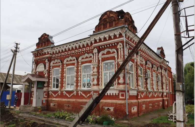 1. Местоположение Объекта в структуре города: •В квартале, ограниченном ул. Коммунистическая, ул. Советская, ул. Пугачёва, ул. Степана Разина;на пересечении улиц Советской и. Коммунистической. Красным прямоугольником выделен исследуемый объект2. Габариты, объемно-планировочная композиция и конструктивное решение здания: •этажность (одноэтажное с мезонином) здание;•форма в плане прямоугольная;•кровля – вальмовая; •местоположение несущих стен;•местоположение внутренних лестниц;•симметричная композиция фасада со стороны ул. Коммунистическая;•акцентирование уличных фасадов угловыми ризалитами с аттиками;•стилевое решение фасада (эклектика с элементами псевдорусского стиля);•фасад выполнен в технике открытого кирпича с декоративной обточкой.Планы БТИ 1989 г. План первого этажа План мезонина 3. Композиционное и архитектурно-художественное оформление фасадов, сложившееся на период начала XX в.:Главный (южный) фасад по ул. Коммунистическая [фото 1]: •на 6 световых осей;•симметричная композиция фасада;•раскреповка фасада угловыми ризалитами;•вынос и профиль цокольной части стены;•размещение филёнок с крестообразным декором в цокольной части;•местоположение, габариты и профиль подоконной тяги;•декор фриза -профилированные кронштейны и зубчики;•раскреповка венчающего карниза ризалитами;•профиль и габариты развитого венчающего карниза с городчатым поясом;•местоположение, профиль и габариты аттиков над ризалитами;•декор аттика [фото 2]:-полукруглая дуга обрамления,- декор в виде замкового камня из формованного кирпича,-полуциркульные ложные окна, - рельефная надпись «1908 г.» «СВК» в центре полуциркульного проёма аттика, расположенного в правой части фасада;•типовой декор ризалитов [фото 3]:пилястры―тумба с резным кронштейном в основании пилястры [1],―кубышчатые полуколонны с импостом в основании [2],―спаренные муфтированные полуколонны в верхней части пилястры [3],―декоративные кокошники по верху полуколонн [4], профиль и габариты карниза со ступенчатыми зубчиками [5];Главный фасад: Фото 1. Фото 2. Фото 3.Боковой (восточный) фасад по ул. Советская [фото 4]: •на 5 световых осей, (в том числе дверной проём);•диссимметричная композиция фасада;•раскреповка фасада угловыми ризалитами;•вынос и профиль цокольной части стены;•размещение филёнок с крестообразным декором;•местоположение, габариты и профиль подоконной тяги;•декор фриза профилированными кронштейнами и зубчиками;•раскреповка венчающего карниза ризалитами [фото 5];•профиль и габариты развитого венчающего карниза с городчатым поясом;•местоположение, профиль и габариты аттиков над ризалитами;•декор аттика:-полукруглая дуга обрамления,- декор в виде замкового камня из формованного кирпича,-полуциркульные ложные окна; •типовой декор ризалитов:пилястры:―тумба с резным кронштейном в основании пилястры,―кубышчатые полуколонны с импостом в основании,―спаренные муфтированные полуколонны в верхней части пилястры,―декоративные кокошники по верху полуколонн, профиль и габариты карниза со ступенчатыми зубчиками;•общие габариты, материал исполнения козырька; Фото 4. Фото 5.Дворовый (северный) фасад [фото 6,7]•вынос и габариты цокольной части стены;•профиль и габариты развитого венчающего карниза с городчатым поясом;•декор фриза профилированной тягой и зуб