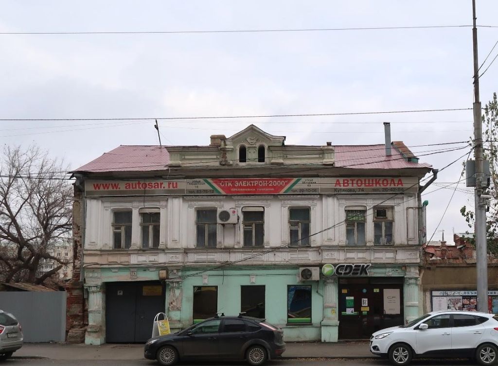 1Градостроительные характеристики:- местоположение в структуре городской застройки: - по линии застройки четнойстороны ул. им. Кутякова И.С., между ул. им. Чапаева В.И. и ул. им. Рахова В.Г.2Объёмно- пространственное композиционное построение здания со всеми фасадами: -габариты здания;-Г-образная форма в плане.3Композиционное и архитектурно-художественное оформление фасадов:3.1- юго-западного (главного) фасада: -симметричная относительно центральной оси, трехчастная композиция из основного ибоковых объемов;-основной объем в три световые оси;-левый боковой объем в двесветовые оси с проездной аркой и сдвоенными оконными проемами в уровне второго этажа;-правый боковой объем в две световые оси со сдвоенными дверными проемами в уровне первого этажа. 4Характер отделки фасадов:4.1- основного ибоковых объемов юго-западного (главного) фасада: - отделка гладкой штукатуркой.5Световые проемы – местоположение, форма, габариты и архитектурное оформление:5.1- основного объема юго-западного (главного) фасада второго этажа: -прямоугольная форма оконного проема с завершением псевдо-трехцентровой аркой;-массивный наличник,декорированный лепными элементами геометрического рисунка над окном истилизованными, пилястрами по бокам: каннелированный ствол пилястры,каннелированный пьедестал;-подоконная филенка (форма, габариты, рисунок);-профилированный сандрик«полочка»;-профилированный подоконный карниз, объединяющий оконныепроемы по нижнему контуру, раскрепованный по пилястрам и лопаткам;-рисунок расстекловки оконного проема.5.2- боковых объемов юго-западного (главного) фасада второго этажа: -композиция из двух оконных проемов прямоугольной формы с завершением псевдо- трехцентровой аркой;-массивный наличник на два окна, декорированный лепными элементами геометрического рисунка над окнами истилизованными пилястрами по бокам и в простенке:каннелированный ствол пилястры, каннелированный пьедестал;-подоконная филенка (форма, габариты, рисунок);-профилированный сандрик«полочка» на два окна;-профилированный подоконный карниз, объединяющий оконныепроемы по нижнему контуру, раскрепованный по пилястрам и лопаткам;-рисунок расстекловки оконного проема. 6Элементы вертикального членения фасада - архитектурное оформление, местоположение, форма и габариты:6.1- полуколонныбоковых объемов юго-западного (главного) фасада вуровне первого этажа: -форма и габариты полуколонны;-ствол полуколонны,декорированный профилем и каннелюрами;-стилизованная композитная капитель;-база и пьедестал полуколонны.6.2- лопатки боковых объемов юго-западного (главного) фасада в уровне второго этажа: -форма и габариты лопатки;-филенчатый ствол лопатки;-пьедестал лопатки в уровне междуэтажного карниза,декорированный лепным декором растительного характера. 7Элементы горизонтального членения - архитектурное оформление, форма и габариты:7.1- междуэтажныйкарниз основного и боковых объемовюго-западного (главного) фасада: - профилированныймеждуэтажный карниз.7.2- венчающий карниз основного и боковых объемов юго-западного (главного) фасада: - профилированный венчающий карниз.8Декор – архитектурное оформление, местоположение, форма и габариты:8.1- основного объема юго-западного (главного) фасада по осям световых проемов в уровне первого этажа: - замковый камень, раскрепованный помеж