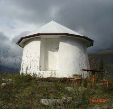 1. Объемно-пространственное исторические габариты, конфигурация и местоположение решение: круглого в плане строения, диаметр в основании 3,3м, высота под кровлю 1,8м, входом на юг, силуэт сужается к верху.2. Конструктивная фундамент; система: наружные стены из каменной кладки на известковом растворе; коническая кровля по деревянным стропилам покрытая металлическим листом.3. Объемно- планировочное решение: историческое объемно-планировочное решение памятника в его габаритах;4. Архитектурно-художественное решение фасада: материал капитальных стен и техника кладки: каменная кладка на известковом растворе, оштукатуренная и окрашенная белой краской; кровля коническая, покрыта; металлом и окрашена в белый цвет; местоположение, размер, оформление дверных и оконных проемов.