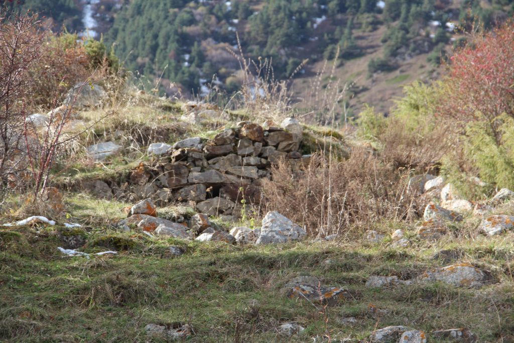 1. Композиционная значимость склепа в структуре некрополя. Склеп расположен в северо-восточной части некрополя, к северу от селения Координаты в системе WGS 84: N 42°59'29,6\"; E 43°45'17,5\". На некрополе захоронения в грунте, наземные и полуподземные склепы, каменные стелы и другие надгробные сооружения.2. Археологические недвижимые и движимые объекты, содержащиеся в склепе и под ним (погребальные и поминальные конструкции, антропологические и остеологические материалы, археологические предметы, следы погребальных и поминальных ритуалов). 3. Сохранившиеся подлинные конструкции склепа. 4. Материал, из которого был построен склеп, – известняковые, гранитные блоки и плиты (цветовая гамма – оттенки серого и коричневого). 5. Характер кладки – бутовая на известковом растворе, с хаотичной перевязкой швов.6. Типологические характеристики, включая объемно- планировочное решение и фасад. Склеп полуподземный, прямоугольный в плане, сложен на известковом растворе, все стены возведены выше поверхности земли. Лаз трапециевидной формы устроен на уровне земли в юго-восточной стене, ширина 0,4-0,6 м, высота 0,8 м, толщина стены в проеме лаза 0,85 м. Плоскость фасада гладкая, фасад во всю ширину завершает треугольный полуфронтон, оформленный по верху козырьком (венчающим карнизом) из каменных плит, нависающих на 0,25 м. Фасады и камера были обмазаны известковым раствором. Ложный свод камеры перекрыт каменными плитами, ширина гребня свода 0,95м. Покрытие слабо выраженное двускатное, покатое. Слева и справа к склепу были пристроены подпорные стенки.7. Внутренние архитектурно- конструктивные элементы склепа. Лаз устроен в 0,7 м от пола камеры. Вдоль продольных стен камеры, грубо обмазанных известковым раствором, на уровне лаза выложены каменные полочки шириной 0,6 и 0,4 (м). Длина камеры 3,5 м, ширина 1,75 м. высота 1,9 м, ширина гребня «ложного» свода 0,95 м. Стены камеры были обмазаны известковым раствором.