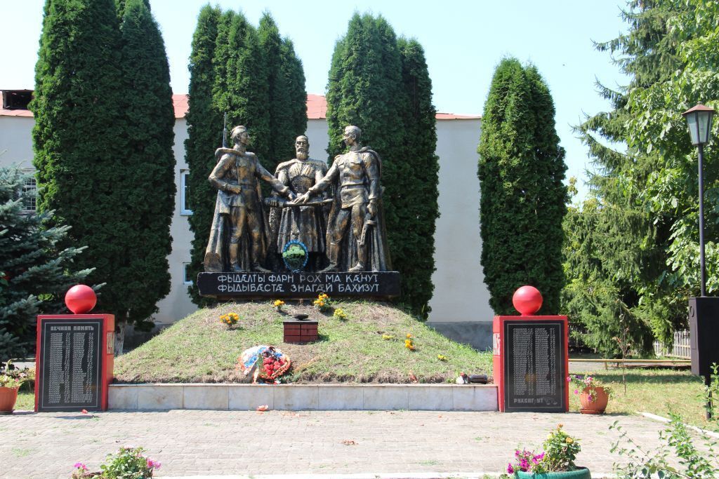 Месторасположенияобъекта впланировочнойструктуре селения.Композиционнаязначимость (роль) висторическисложившейсяландшафтной средеселения. Мемориальнаякомпозицияразмещена наискусственнойкольцевой насыпиперед фасадом администрации.В центре —скульптура старогогорца в черкеске скинжаломв руках, к немуобращены фигурызрелого воина июноши-новобранца,стоящие,соответственно,слева и справа.Мемориальнаякомпозициявоспроизводитобряд принесенияклятвы на верностьдруг другу ибратство в бою.На переднем планеслева и справаустановленытумбообразныеобъемы,на лицевыхплоскостях которыхначертаны имена130 земляков, невернувшихся свойны.