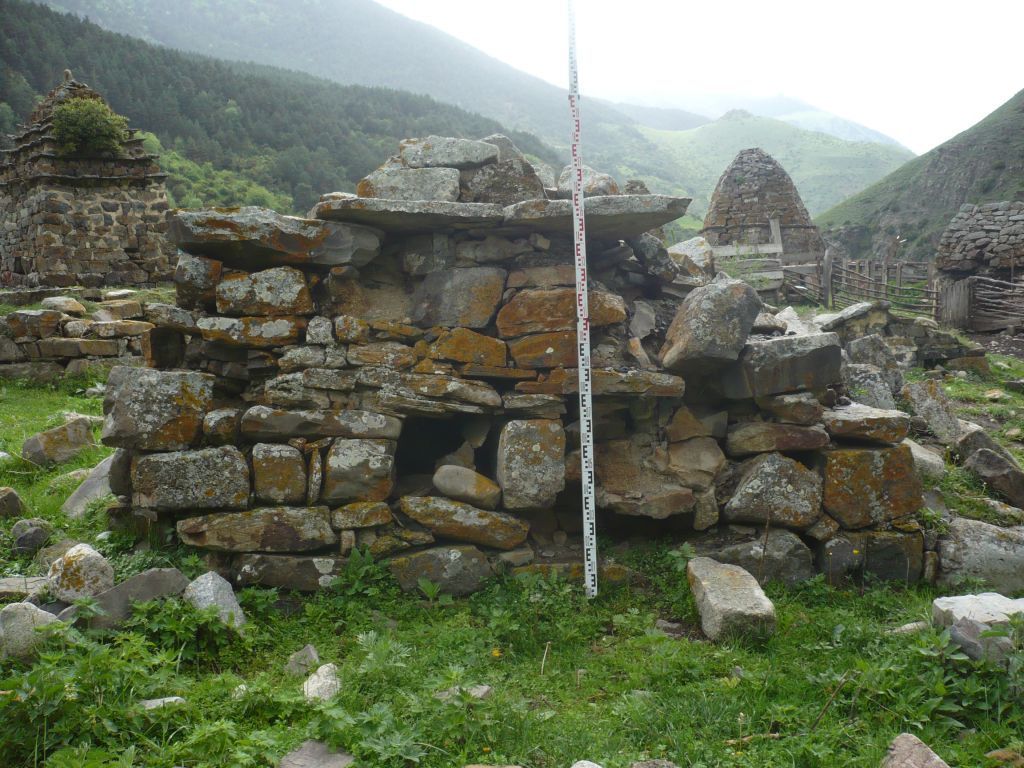 Композиционнаязначимость склепа вструктуре некрополя.Склеп расположен всеверной частиобширногонекрополя, целикомзанимавшегомежпойменный мысв конце одного изсеверных отроговг.Уилпата,оформленныйслиянием рекСонгутидон иСардидон.Координаты всистеме WGS 84:N 42°56'15.3\";Е 43°49'5.6\".На некрополезахоронения вгрунте, башенные,наземные иполуподземныесклепы, каменныестелы и другиенадгробныесооружения. Внешниеархитектурноконструктивныеидекоративныеэлементы склепа.В северо-восточнойстене на высоте 0,65м от земли устроенчетырехугольныйлаз: ширина - 0,35 м,высота - 0,57 м.Справа от лаза нишауправлениязапорнымустройством.Г оризонтал ьныйперехода стен вперекрытие, навысоте 2,23 м(относительноуровня земли северо-восточного фасада),по северо-западной июго-восточнойстенам проходиткозырек из 1 рядаизвестняковых плит.Над лазом, в верхущипца устроеновентиляционноеотверстие.Покрытие венчаетсоставной каменныйгребень-конек из 6подогнанных камней. Сохранившиеся конструкции склепа. Археологические недвижимые и движимые объекты, содержащиеся в склепе и под ним (погребальные и поминальные конструкции, антропологические и остеологические материалы, археологические предметы, следы погребальных и поминальных ритуалов). Материал, из которого построен склеп, - известняковые, гранитные блоки и плиты (цветовая гамма - оттенки серого и коричневого). Характер кладки - бутовая на известковом растворе, с хаотичной перевязкой швов. Типологические характеристики, включая объемно планировочное решение и фасад. Склеп наземный, перекрытие двускатное, ложносводчатое покрытие плоское, покатое. Грани и углы плавно сходятся кверху. Основные габаритысклепа:Длина в плане 3,6 м,ширина - 2,8 м,высота по северо-восточной грани -3,8мТолщина стены впроеме лаза 0,8 м. Силуэтныехарактеристикисклепа.Характер и составобмазки фасадов.Сохранилисьфрагментыизвестковой обмазкицвета светлой охры. Сохранившийся вофрагментеизвестковой обмазкина юго-восточномфасаде вдавленныйотпечаток левойладони размером 15 х16 (см), на высоте0,75 м отповерхности земли и0,4 м от южного угла. Внутренниеархитектурноконструктивныеэлементы склепа.Камера склепа имеетложносводчатоеустройство.Длина камеры 1,95м,ширина - 1,30 м,высота - 1,75 м,ширина гребня«ложного» свода -0,30 м. Лаз на 0,80 мотстоит от пола.Стены камерыобмазаныизвестковымраствором. Элементыдеревянногозаполнения лаза идеревянногозапорного механизма.