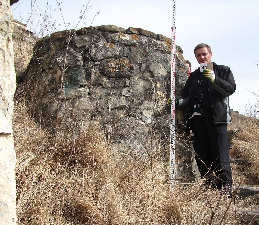 1. Объемно-пространственное решение: исторические габариты, местоположение и конфигурация круглого в плане склепа, диаметр. 2,1м, высота 2,2м.2. Конструктивная система: фундаменты; исторические наружные стены-местоположение, вид материала (камень); перекрытие-плоское каменное.3. Объемно-планировочное решение: историческое объемно-планировочное решение наземного склепа в габаритах наружных стен.4. Архитектурно-художественное решение: материал и вид отделки фасадов-каменная, сложена из разно-размерных камней на известковом растворе кладка.