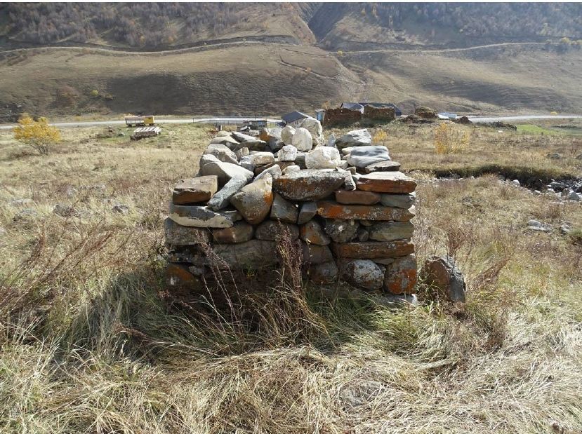 1. Место расположения святилищаСвятилище находится на склоне в левом борту Мамисонской долины, между рукавов ручья Камсходон, в 110 м севернее северо-восточного квартала селения Камсхо, кварталы расположены в 180 м друг от друга, на левом берегу р.Мамисондон, на спускающейся к реке наклонной террасе.Географические координаты святилища в системе WGS-84: N 42°39’51,5”; E 43°50’30,38”.2. Силуэтная характеристика объекта и природной среды3. Типологические характеристики строения. Подквадратное в плане, сложенное из камня капище, сужающееся кверху, поверх сложены несколько белых камней (кварц). Ниша имеется в южной грани капища. 4. Основные габариты капищаРазмеры сечения у основания: запад – 2 м, юг – 2,1 м, восток – 2,15 м, север – 2м. Размеры сечения вверху: запад – 1,63 м, юг – 1,7 м, восток – 1,95 м, север – 1,72 м. размерами в плане 1,6 х 1,5 (м). Высота южной грани от уровня земли – 1,95 м, северной грани около 1 м.5. Размеры и расположение ниши Снизу, с подъема, с южной стороны, на высоте 1,25 м от земли, имеется ниша. Её ширина 50 см, высота 30 см. Ниша по горизонтали смещена влево на 10 см.6. Материал, из которого сложено святилище, характер кладкиКапище сложено насухо из сланцевых, гранитных и известняковых необработанных блоков, ломаного пластинчатого сланца. Кладка бутовая с хаотичной перевязкой швов.7. Секторы и направления видовых раскрытий, визуальные связи памятника.Ввиду небольшого объема и расположения на открытом пространстве святилище визуально раскрывается с небольших расстояний со всех сторон. 8. Археологические недвижимые и движимые объекты, содержащиеся под поверхностью территории святилища Погребальные и поминальные конструкции, антропологические и остеологические материалы, археологические предметы, следы погребальных и поминальных ритуалов.