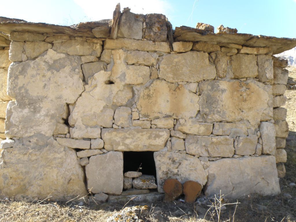 1. Место расположения склепа в планировочной структуре селения. Склеп впущен в склон юго-западнее просторного скального выступа, на котором расположен небольшой квартал с двумя башнями. В 17 м к северо-западу от склепа проходит кромка крутого обрывистого склона. 2. Композиционная значимость склепа в структуре застройки.3. Археологические недвижимые и движимые объекты, содержащиеся в склепе и под ним (погребальные и поминальные конструкции, антропологические и остеологические материалы, археологические предметы, следы погребальных и поминальных ритуалов).4. Сохранившиеся конструкции склепа5. Материал, из которого построен склеп, – известняковые блоки, ломаный пластинчатый сланец (цветовая гамма – светло-серый, светло-коричневый)6. Характер кладки – бутовая на известковом растворе, с хаотичной перевязкой швов.7. Типологические характеристики, включая объемно-планировочное решение и фасад. Склеп полуподземный, перекрытие ложносводчатое, покрытие плоское, покатое. В полу имеется еще одна погребальная камера, округлая в плане.8. Основные габариты склепа. Склеп в плане неправильной формы, длина и ширина склепа около 4,3 м. Высота со стороны фасада 2,5 м. Толщина стены в проеме лаза 1 м.9. Внешние архитектурно-конструктивные и декоративные элементы склепа.Фасады по периметру венчают широкие сланцевые плиты, нависающие над стенами, играющие роль слезника. Восточная фасадная стена: её гладкая, выступающая на 0,4 м часть шириной 3,5 м, имеет вид широкого ризалита, сверху посередине оформлена небольшой прямоугольной вставкой из двух известняковых блоков, имитирующей щипец. Ширина вставки 0,7 м. Боковые стены выступают на 0,45 м. Лаз устроен почти на уровне земли. 10. Лаз, его расположение, размеры и форма. Прямоугольный лаз с цельной перемычкой устроен посередине главного фасада, почти на уровне земли. Высота лаза 0,52 м, ширина – 0,42 м Сохранились фрагменты деревянного заполнения лаза.11. Два вытесанных элемента упавших каменных наверший (прислонены к фасаду справа от лаза). Характер и состав обмазки фасада. Сохранились фрагменты известковой обмазки цвета светлой охры.12. Внутренние архитектурно-конструктивные элементы склепа. Камера склепа имеет ложносводчатое устройство. Стены камеры обмазаны известковым раствором, в полу имеется еще одна камера, округлая в плане.