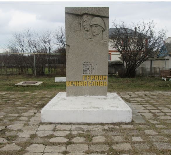 - Местоположение памятника;- Объемно-пространственная композиция памятника в виде прямоугольной вертикальной стелы на прямоугольном в плане основании с барельефом в верхней части и мемориальной надписью в нижней;- Материал памятника – бетон и инкерманский известняк;- Художественное оформление: барельефный обобщенный портрет солдат, габариты стелы (1,40 х 0,50 х 3,20 м) и прямоугольного основания (2,35 х 3,05 х 0,35 м);- Мемориальная надпись на лицевой стороне памятника, выполненная в технике гравировки: «Грибов И.К. // Москаленко С.Я. // Сухий П.Н. // Фанин П.Л. // Фанин Н.П. и надпись «Героям // вечная слава», выполненная рельефным шрифтом, окрашенным в охристый цвет.Предмет охраны может быть уточнен в процессе проведения комплексных научных исследований и производства реставрационных работ.