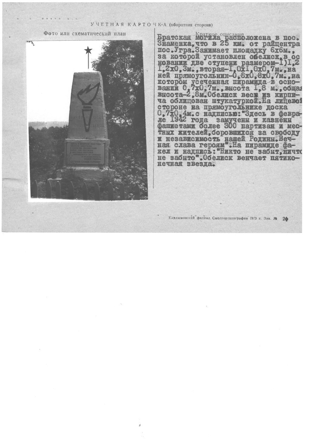 Братская могила 300 советских патриотов, казненных гитлеровцами в 1942 г. Установлен обелиск