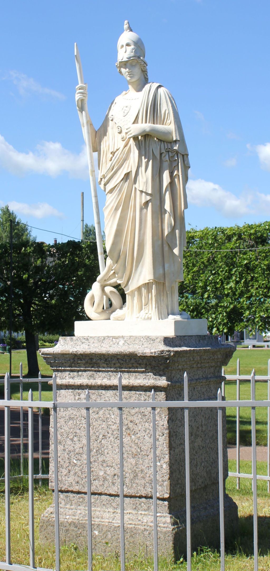 статуя «Афина Джустиниана» на плинте (мрамор, рубка, шлифовка), установлена с западной стороны дворца Марли за прудом Секторальный с тремя мостами; изображение стоящей женской фигуры в полный рост; голова повернута к левому плечу, на ней высокий шлем с глазницами и рельефом бараньих голов, торс повернут влево, правая рука, согнута в локте и поднята вверх, опирается о копье, левой рукой придерживает плащ, под плащом туника, на груди панцирь с рельефным изображением головы Медузы, на ногах сандалии, у правой ноги извивающаяся змея с поднятой вверх головой, основание прямоугольное;пьедестал гранитный прямоугольный в плане, с профилированным карнизом и базой.