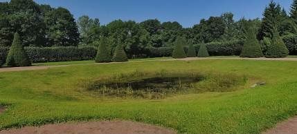 Гидротехническое сооружение:пруд – историческое местоположение (в западной части Елевогорского сада на верхней террасе Нижнего парка, № 74 на плане границ), конфигурация (круглый в плане), габариты;историческое берегоукрепление – дерновые откосы.