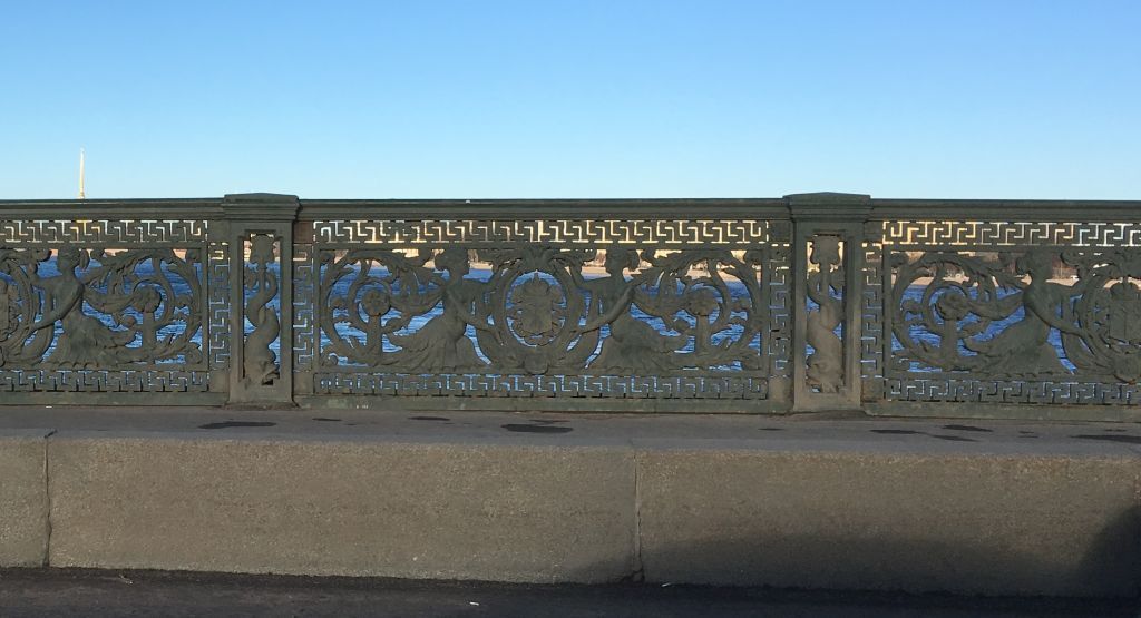 Архитектурно-художественное решение: перильное ограждение моста:местоположение, конфигурация,габариты, материал, рисунок звеньев: на постоянных пролетах чугунные стойки и чугунные литые секции (в центре секции перил картуш (щит с гербом города) — перекрещенные скипетр, морской и речной якоря в руках двух русалок, хвосты которых вплетены в растительный орнамент, в просветах чугунных столбиков — морские животные, орнамент меандр по периметру секций); перильное ограждение разводного пролета материал - металл;
