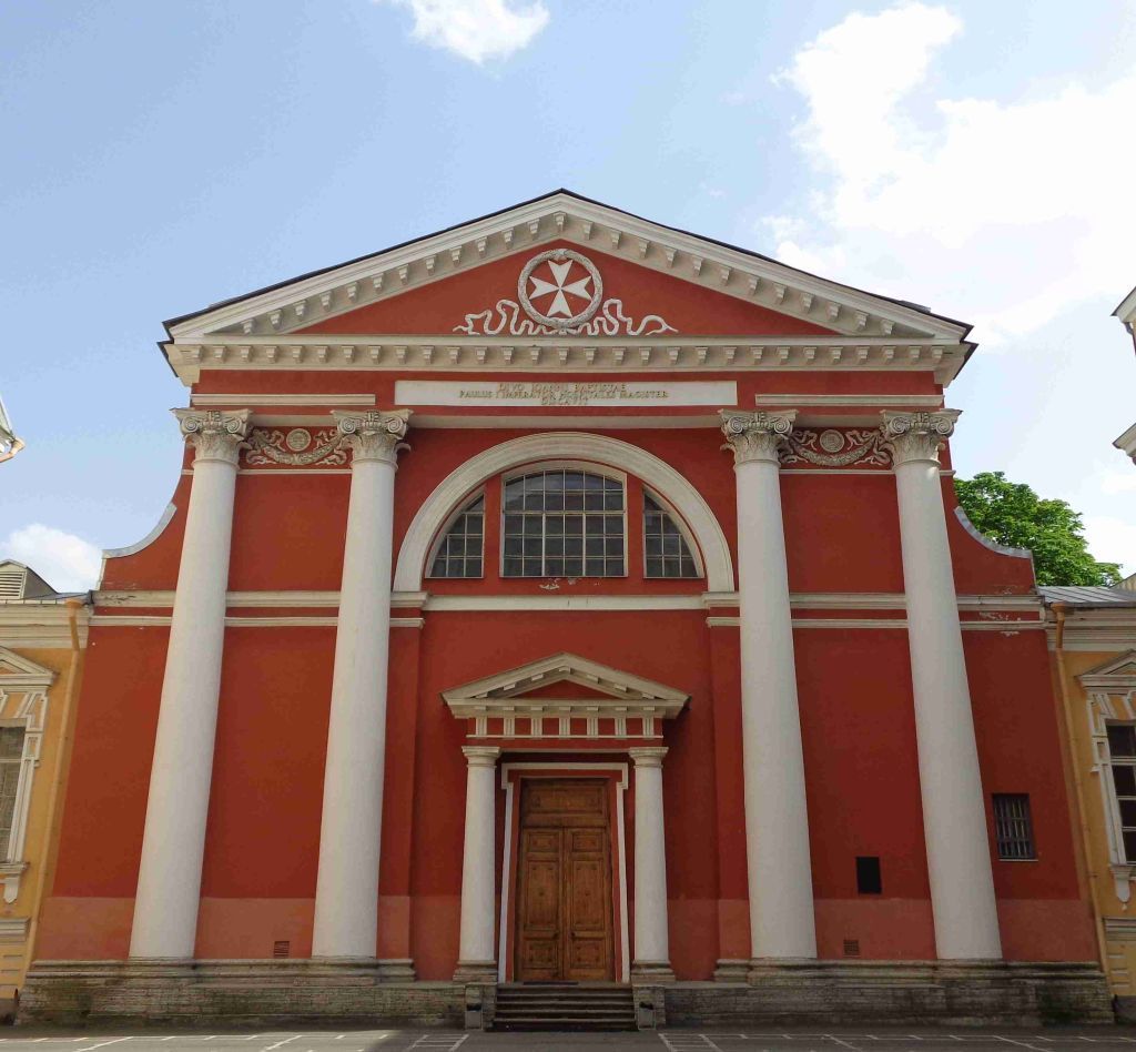 Объемно-пространственное решение:габариты и конфигурация прямоугольного в плане здания с тремя апсидами, двумя пастрофориями и деамбулаторием на юго-восточном фасаде; форма, высотные отметки, габариты и конфигурация крыши;форма, высотные отметки, габариты и конфигурация полукупола центральной апсиды.Конструктивная система:наружные и внутренние капитальные стены (кирпичные); междуэтажные перекрытия;своды перекрытий в том числе:крестовые и коробовые своды, опирающиеся на пилоны, облицованные в основании плитами известняка;стрельчатый свод, перекрывающий помещение северо-восточной апсиды;цилиндрический свод, перекрывающий пастрофорий, северо-восточной апсиды;сферический полукупол, перекрывающий алтарную часть храма;два цилиндрических свода, перекрывающие основной объем храма, над центральным нефом образуют крестовый свод;исторические лестницы:две симметрично расположенные лестницы, расположены в северо-западной части здания, вход организован из помещений боковых нефов:в уровне подвала - второго яруса четырехмаршевые, средистенные, с забежными ступенями;ступени выполнены из лещадной плиты;в уровне второго - антресольного этажа - деревянные;лестница, расположенная в северо-восточной части здания, в уровне второго яруса - антресольного этажа: один марш в семь ступеней; ступени выполнены из лещадной плиты;Объемно-планировочное решение:историческое объемно-планировочное решение в габаритах капитальных стен.Архитектурно-художественное решение фасадов:лицевой фасад - одноосный, обращен во внутренний двор дворца, архитектурно-художественное решение в приемах зрелого классицизма:материал и характер отделки фасада: оштукатурен, окрашен, высокий цоколь облицован плитами известняка; фасад решен как четырехколонный портик композитного ордера, завершенный треугольным фронтоном, в тимпане - лепная рельефная композиция - дубовый венок с лентами и мальтийским крестом в центре;колонны несут антаблемент с широким фризом, заполненным надписью и профилированным карнизом с мутулами;прямоугольный дверной проем, расположенный по центральной оси фасада, обрамлен наличником с ушками, фланкирован колоннами тосканского ордера, несущими антаблемент с триглифно-метопным фризом и карнизом с мутулами, и треугольный фронтон;крыльцо в пять ступеней из красного гранита;заполнение дверного проема*: двери дубовые, двустворчатые, филенчатые, глухие с прямоугольной глухой фрамугой (*воссоздано); фурнитура - латунные (?), дверные ручки*, выполненные в виде правой и левой кистей рук, сжимающих круглые в сечении профилированные свитки (?); (*воссозданы);трехчастный оконный проем с полуциркульной перемычкой, расположенный по центральной оси фасада, над входным порталом;профилированный архивольт, опирающийся на импост;заполнение оконного проема – материал (дерево), цвет (по результатам расчисток и архивных исследований), исторический рисунок расстекловки;широкий фриз с лепными фруктовыми гирляндами, лентами и розетками;дворовые фасады:материал и характер отделки фасада: оштукатурен, окрашен; оконные проемы: местоположение, конфигурация (прямоугольные и с полуциркульными перемычками), габариты;профилированные архивольты;заполнения оконных проемов: материал (дерево), исторический рисунок расстекловки, цвет - по результатам расчисток