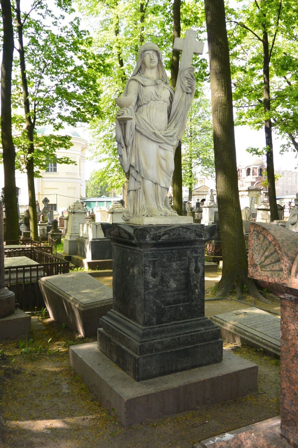 Объемно-пространственное и архитектурно-художественное решение: местоположение захоронения, габариты и конфигурация надгробия; авторское художественное решение надгробия: мраморная аллегорическая скульптура «Вера» на постаменте-жертвеннике из черного природного камня; характер и содержание надгробной надписи.