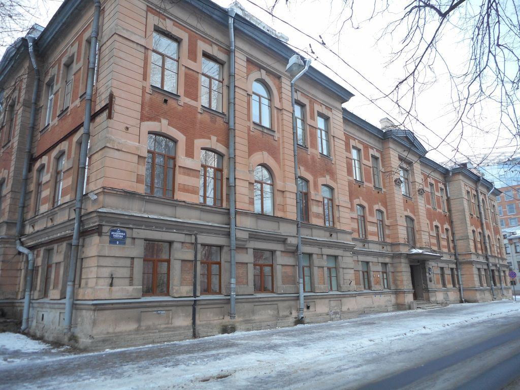 Объемно-пространственное решениеместоположение, габариты, конфигурация прямоугольного в плане 3-4-хэтажного здания с тремя выступающими объемами на северном фасаде, обращенном в сторону реки Большой Невки, центральными ризалитами лестничных объемов на торцевых фасадах и тремя ризалитами (боковые — с раскреповками) на главном фасаде по ул. Академика Павлова.купол шлемовидной формы на кирпичном барабане над помещением бывш. Домовой церкви со стороны набережной;крыша – габариты, конфигурация (скатная);аттиковые стенки и тумбы;кирпичные дымовые трубы.Конструктивная системанаружные и внутренние капитальные кирпичные стены.две лестницы – местоположение, габариты лестничной клетки;полусферический купол бывш. Домовой церкви на парусах; своды с распалубками боковых компартиментов.столбы-опоры, поддерживающие арки;Объемно-планировочное решение:историческое решение вестибюля и бывшей Домовой церкви.Архитектурно-художественное решение фасадов:в приемах и формах эклектики. материал и характер обработки фасадной поверхности:известняковый цоколь; сочетание кирпичной кладки и оштукатуренных элементов (лопаток, наличников и т.п.); исторические оконные и дверные проемы -местоположение, габариты, конфигурация;оконные заполнения –рисунок расстекловки.плоский козырек над главным входом;металлические кованые кронштейны;оформление оконных проемов гладкими наличниками (в уровне 2 и 3 эт. — с замковыми камнями);оформление угловых частей рустованными штукатурными лопатками; горизонтальные гладкие штукатурные пояса; междуэтажный профилированный штукатурный карниз на уровне 1–2-го эт.; прямоугольные филенки под окнами 1 и 2-го этажей; венчающий профилированный карниз;прямоугольные аттики и столбы ограждения крыши над боковыми ризалитами;треугольный фронтон над центральным ризалитом главного фасада.Художественно -декоративная отделка интерьера:Тамбур – деревянный, полусветлый, филенчатый;двери входные – деревянные, двустворные, полусветлые, филенчатые, с внутренней стороны оформлены фигарейными резными филенками с розетками;одно-, двустворчатые полусветлые, филенчатые двери со стороны помещения;покрытие пола тамбура – метлахская плитка, полихромная, с орнаментальным бордюром.
