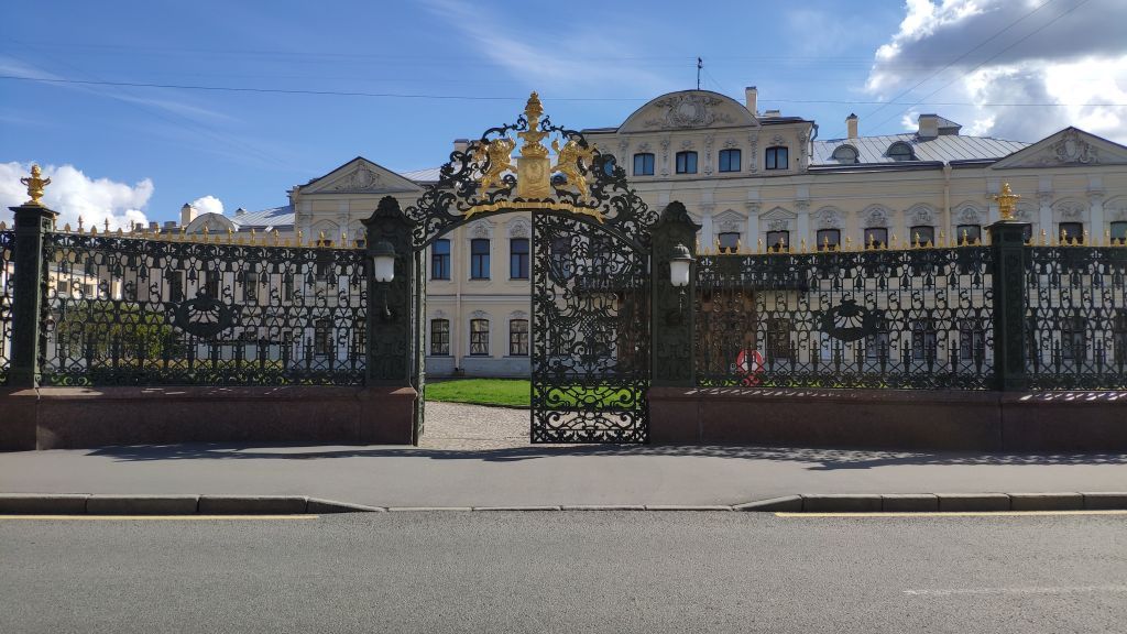 Объемно-пространственное решение и конструктивная система:чугунная ограда со стороны наб. реки Фонтанки, с вогнутыми секциями, прилегающими к воротам;воротный проезд с двустворными воротами. Архитектурно-художественное решение:гранитный цоколь;звенья чугунной ограды с декоративными элементами в стиле барокко (рокайли, волюты, детали растительного характера) и пилоны ограды выполнены в технике художественного литья, с навершием в виде золоченых пик, пальметт и вазонов;ворота:пилоны ворот выполнены в технике художественного литья;контрфорсы пилонов сложной конфигурации с восточной стороны ограды, створки ворот выполнены в технике художественного литья;картуш сложной конфигурации с золоченой геральдической композицией в центре (герб Шереметевых);два фонаря пилонов со стороны наб. реки Фонтанки.