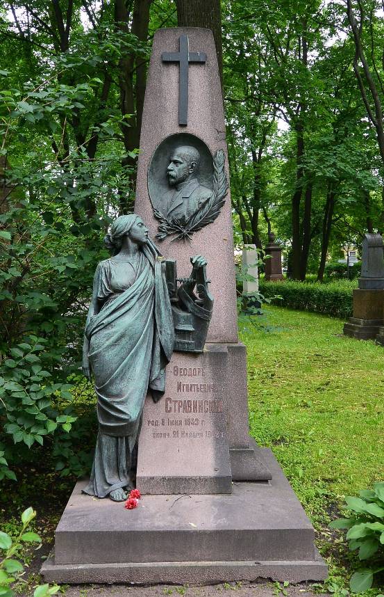 Объемно-пространственное и архитектурно-художественное решение:историческое местоположение захоронения и конфигурация надгробия; авторское художественное решение надгробия в виде трапециевидной прямоугольной в плане стелы из красного гранита, на прямоугольном в плане профилированном пьедестале и гранитном основании, на лицевой поверхности стелы расположен бронзовый крест и овальной формы портретный горельеф, декорированный элементами растительного характера, перед стелой расположена полнофигурная бронзовая скульптура музы, опирающейся на лиру; рельефные символы, характер и содержание надгробных надписей.