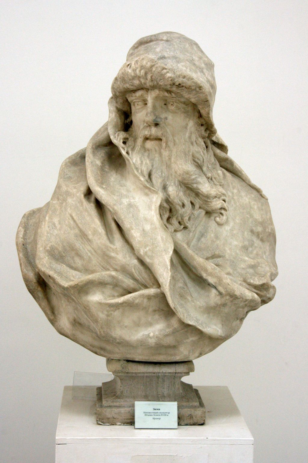 Объемно-пространственное и пластическое решение;погрудное изображение пожилого мужчины с бородой, в плаще и с шапкой на голове; аллегория зимы; ножка прямоугольная в сечении с профилировками; XVIII в., белый мрамор.