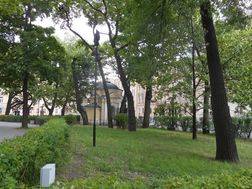 Объемно-пространственное решение:Местоположение (вокруг собора, по периметру овального в плане участка).Объемно-планировочная структура участка:Объемно-планировочная структура участка по проекту арх. В. П. Стасова;сад с элементами регулярной планировки, окружен исторической оградой, поделен на пять не равных частей, обнесенных низкой железной решеткой и образованных проходами от калиток (в северо-восточной и южной (от часовни) частях участка), проездами (северо-западной и юго-западной частях участка) и широким западным проходом от главных ворот ограды.Художественное решение и видовой состав объекта:Каждая из пяти частей сада представляет собой сочетание газона обыкновенного с одиночными посадками деревьев по периметру (преимущественно – дубы, липы), с живыми изгородями кустарником (кизильник).