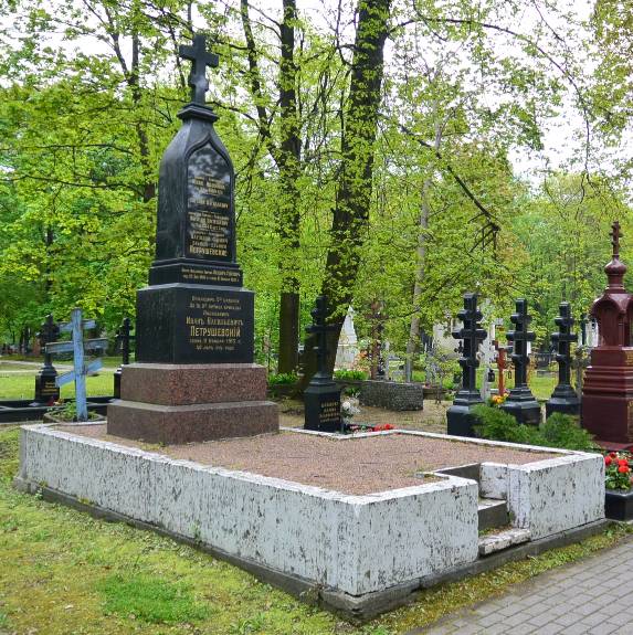 Объемно-пространственное и архитектурно-художественное решение:историческое местоположение захоронения, габариты и конфигурация надгробия; историческое решение надгробия из тёмного гранита в виде каплицы увенчаной крестом с базой на прямоугольном в плане профилированном пьедестале и двухступенчатом основании из красного гранита, надгробие установлено на земляной площадке высокого подиума ограниченного поребриком из известняка; рельефные символы, характер и содержание надгробных надписей.