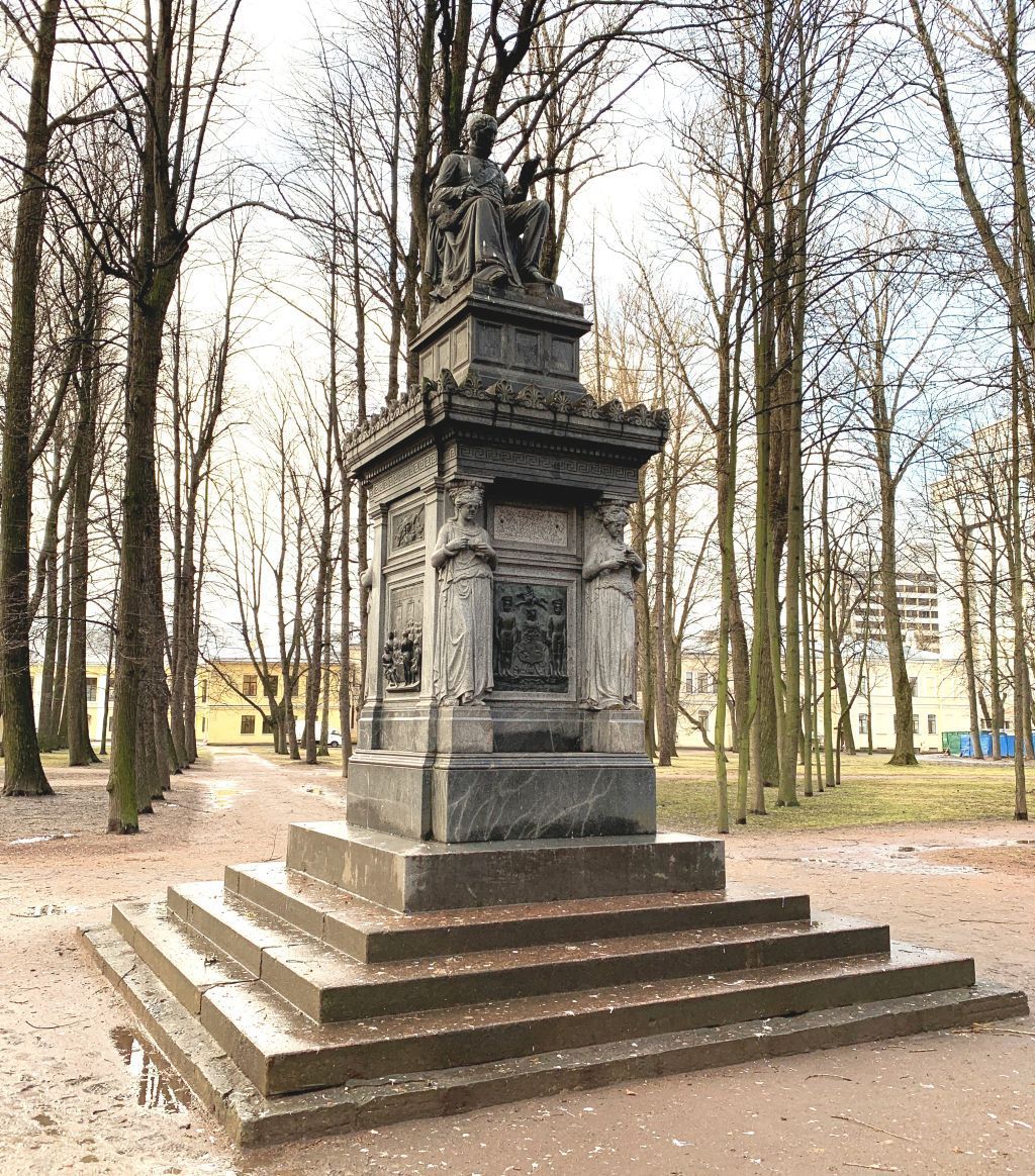 Памятник врачу Виллие Я.В., 1859г., Большой Сампсониевский пр., 5Иная видовая принадлежность:Памятник:Фигура доктора медицины и хирурга Я.В.Вилле в парадной военно-медицинской форме с орденами, сидящая на скале. У ног видна каска и книга. В правой руке держит карандаш, в левой руке – свиток. Фигура отлита из бронзы. Скала – мрамор.Пьедестал с кариатидами, олицетворяющими богиню здоровья Гигею, из черного гранита, декорирован литыми из бронзы гербом Я.В.Вилле и двумя барельефами.