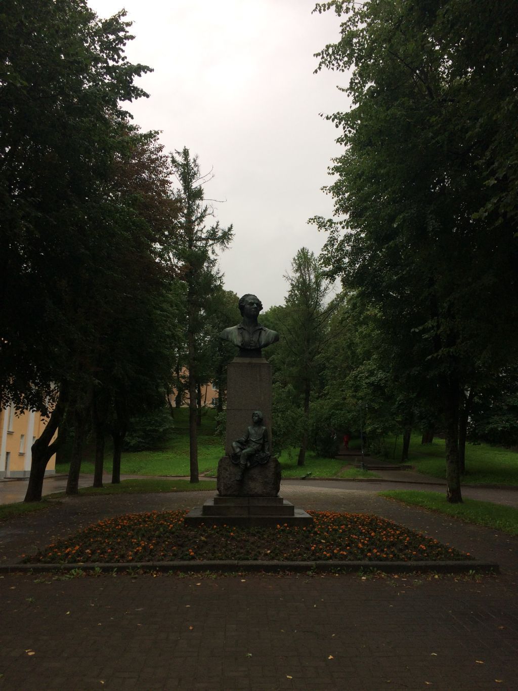 местоположение, габариты и конфигурация монумента, материал (бронза, гранит);бюст ученого-энциклопедиста Ломоносова Михаила Васильевича (скульптор Гликман Гавриил Давидович) установлен на трехчастный гранитный постамент, расположенныйна трехступенчатом гранитном цоколе; на нижней части гранитного постамента находится фигура сидящего мальчика в лаптях (олицетворение М.В. Ломоносова в детстве).