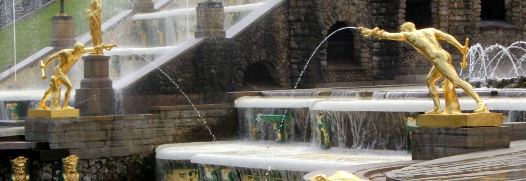 две парные фонтанные статуи «Боец Боргезе» (бронза, литье, чеканка, золочение): мужеские обнаженные фигуры установлены симметрично на нижней террасе каскада; сильно наклонные вперед, голова наклонена и повёрнута в профиль к левому плечу, в правой руке, согнутой в локте и отведенной назад, держит опущенный факел, левой рукой, держит змею, правая нога, согнута в колене, выставлена вперёд, левая нога отставлена назад, пальцами касается основания, под пяткой - подставка, у правой ноги – пень, основание прямоугольное.