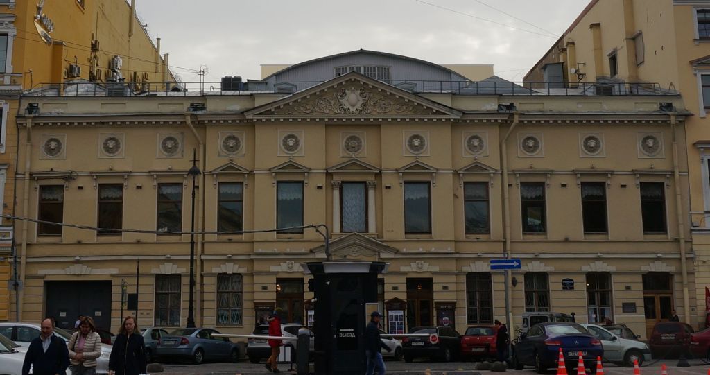 Объемно-пространственное решение: габариты и конфигурация двухэтажного, прямоугольного в плане здания; исторические конфигурация (скатная, сложной конфигурации) и габариты крыши, включая высоту конька, материал окрытия (кровельное железо). Конструктивная система: наружные и внутренние капитальные кирпичные стены; исторические отметки плоских перекрытий; своды: пологий цилиндрический свод воротного проезда; сводчатое перекрытие помещения цокольного этажа, смежного с вестибюлем служебного входа (б. дворницкая); сводчатые перекрытия вестибюля служебного входа (крестовые своды, коробовые с распалубками на подпружных арках); сводчатые перекрытия тамбура и вестибюля главного входа (цилиндрический свод по оси главного входа, крестовые своды); цилиндрический свод фойе перед Малым залом; купол на парусах над парадной лестницей – исторические габариты, местоположение; исторические габариты и местоположение утраченного светового фонаря;* *исторический купол со световым фонарем был демонтирован в 1960-х гг., деревянные конструкции были заменены на железобетонные; коробовый свод помещения Галереи; крестовый свод Желтой гостиной; зеркальный свод фойе «Грот»;уплощенные крестовые своды с «нервюрами» (металл?) проходного помещения у фойе Грот; пологий цилиндрический свод зрительного зала; пологий цилиндрический свод над лестничными клетками лестниц, фланкирующих зрительный зал; исторические лестницы Л-1-Л-10: распашная парадная лестница, со ступенями белого мрамора, с площадками, выложенными плитами белого и серого мрамора; ьлитые чугунные ограждения маршей лестницы (звенья ограждения с мотивами стилизованного растительного орнамента и завитков, золоченые бронзовые фигурки путти на стойках); служебные лестницы: трехмаршевая лестница, со ступенями лещадной плиты, ограждениями черного металла (рисунок – вертикальные прутья); двухмаршевые лестницы с маршами по косоурам, с площадками на сводах по металлическим балкам; ступени лестниц лещадной плиты (частично облицованы современной керамической плиткой); ограждения лестничных маршей черного металла (рисунок – вертикальные прутья со вставками в виде рамок в форме ромбов и овалов с заостренными концами); Малый зал, помещение 3-Н(72) пл. 468,6 кв. м: две колонны в центре зала. Объемно-планировочное историческое объемно-планировочное решение. Архитектурно-художественное решение фасадов: архитектурно-художественное решение лицевого фасада в приемах эклектики с элементами в стиле неоренессанс и неоклассицизм; симметричная композиция фасада с центральной раскреповкой, увенчанной треугольным фронтоном; лицевой фасад: материал отделки цоколя – гранит с известняковым (?) валиком в завершении (профиль закрашен); материал отделки фасада – гладкая окрашенная штукатурка; оформление фасада в уровне 1-го этажа линейным рустом; местоположение, габариты и конфигурация дверных проемов (включая три дверных проема разных габаритов в центральной раскреповке фасада, ведущих в главный вестибюль, дверной проем в крайней западной световой оси фасада); исторический материал (дерево) и рисунок дверных заполнений; треугольный полуфронтон над центральным дверным проемом; выделенные перемычки с веерным замковым камнем с женским маскароном над дверными проемами, фланкирующими центральный дверной про