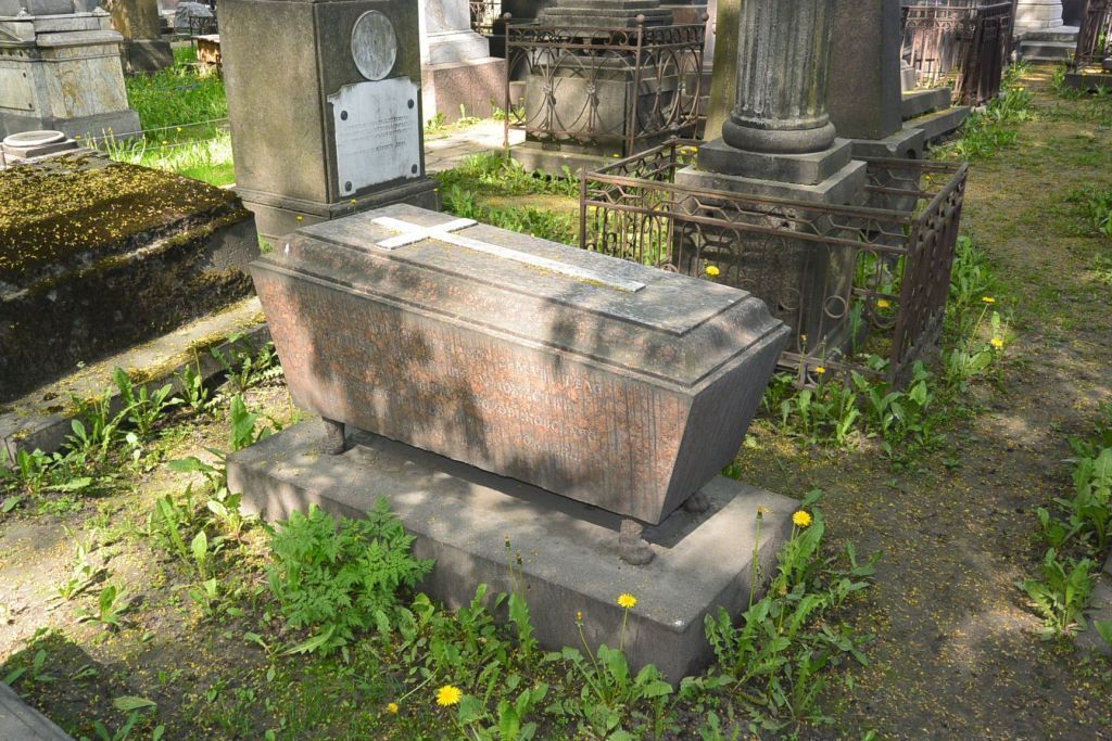 Объемно-пространственное и архитектурно-художественное решение: местоположение захоронения, габариты и конфигурация надгробия; историческое художественное решение надгробия в виде гранитного саркофага с рельефным изображением креста на профилированной крышке, на металлических фигурных опорах в виде львиных лап, с плитой из тесаного камня в основании; характер и содержание надгробных надписей.