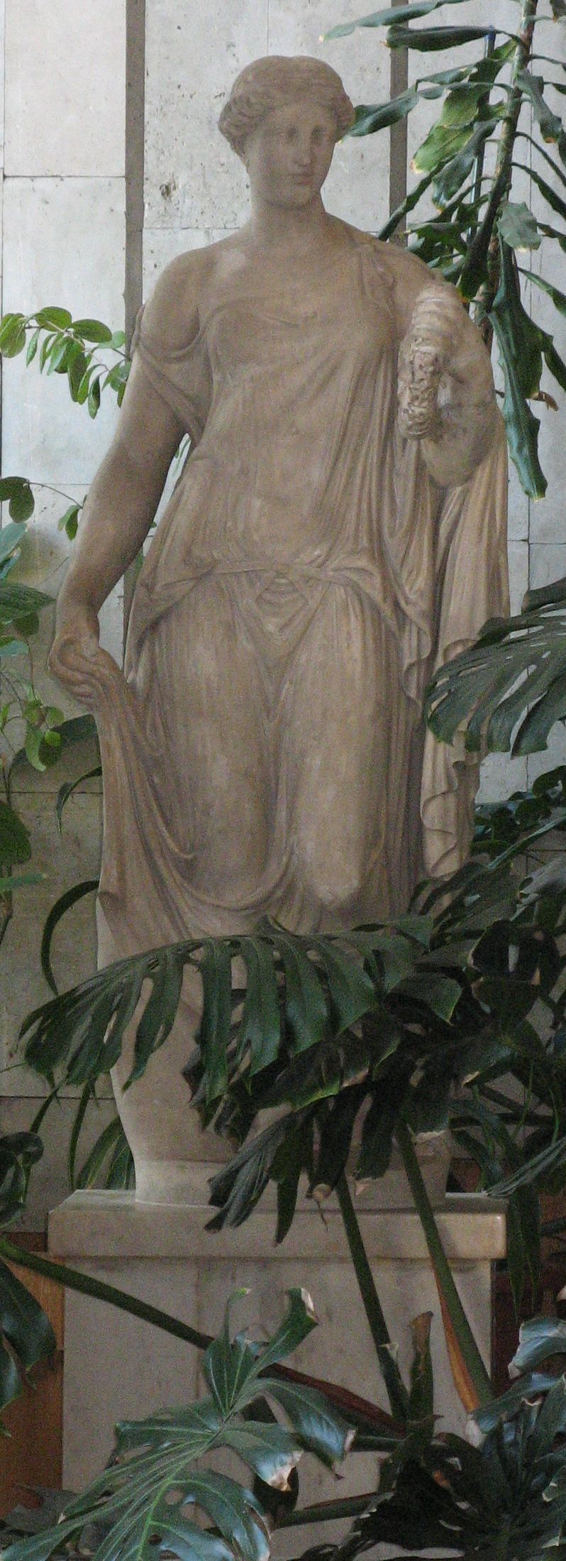 Скульптура белого мрамора, изображающая девушку в античной одежде, установленная на гладком круглом основании, на прямоугольном в сечении, гладком мраморном постаменте: изображена босая девушка в свободно ниспадающей одежде с прической «греческий узел», держащая в левой руке венок, правой рукой поддерживающая подол.