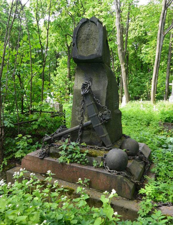 Объемно-пространственное и архитектурно-художественное решение:историческое местоположение захоронения, габариты и конфигурация надгробия (семейное захоронение); историческое художественное надгробие в виде высокой двухчастной стелы-скалы серого кованого гранита на трёхступенчатом основании полированного красного гранита, семейное надгробие декорировано якорем и цепями на массивых шарах-ядрах, расположенных по углам основания (имеются повреждения декора, в верхней части надгробия овальная ниша и следы крепления от утраченного портретного медальона); рельефные символы, характер и содержание надгробных надписей.