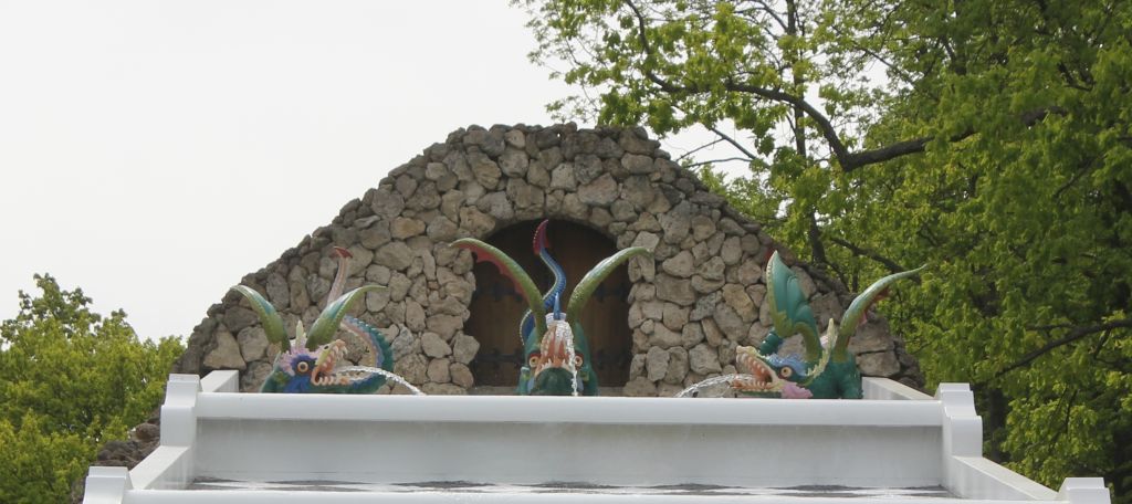 фонтанные фигуры Дракон» (три)* (бронза, масло): установлены у верхнего грота каскада Драконов (по центру, с западной и восточной сторон);*воссозданы в 1952 г. скульптор Гуржий А.Ф.изображение фигуры дракона, стоящего в фас на четырех трехпалых лапах с большими когтями, передние и задние правые лапы выставлены вперед, длинная шея, покрытая чешуей, пригнута к низу, голова поднята вверх, пасть с большими редкими клыками широко открыта, во рту фонтанная трубка, большой язык высунут из пасти, голова покрыта стилизованным орнаментом, от лопаток вверх поднимаются два крыла с острыми концами и орнаментом по краям, от головы до хвоста по спине идет орнаментированный плавник, хвост спирально изогнут и поднят вверх, оканчивается пальметтой, поверхность раскрашена масляной краской в яркие тона, отливка, чеканка, окраска;изображение фигуры дракона, стоящего на четырех широко расставленных трехпалых лапах, туловище изогнуто слева направо, голова поднята вверх, пасть с большими редкими клыками широко открыта, во рту фонтанная трубка, большой язык высунут из пасти, оканчивается стрелкой, большие уши, голова покрыта стилизованным растительным орнаментом, длинная шея изогнута, покрыта чешуей, от лопаток отходят два крыла с острыми концами и орнаментом по краям, от головы до хвоста по спине идет орнаментированный плавник, хвост спирально изогнут и поднят вверх, оканчивается стрелкой, поверхность раскрашена масляной краской в яркие тона, отливка, чеканка, окраска;изображение фигуры дракона, стоящего на четырех широко расставленных трехпалых лапах, туловище изогнуто справа налево, голова поднята вверх, пасть с большими редкими клыками широко открыта, во рту фонтанная трубка, большой язык высунут из пасти, оканчивается стрелкой, большие уши, голова покрыта стилизованным растительным орнаментом, длинная шея изогнута, покрыта чешуей, от лопаток отходят два крыла с острыми концами и орнаментом по краям, от головы до хвоста по спине идет орнаментированный плавник, хвост спирально изогнут и поднят вверх, оканчивается стрелкой, поверхность раскрашена в яркие тона; отливка, чеканка, окраска.