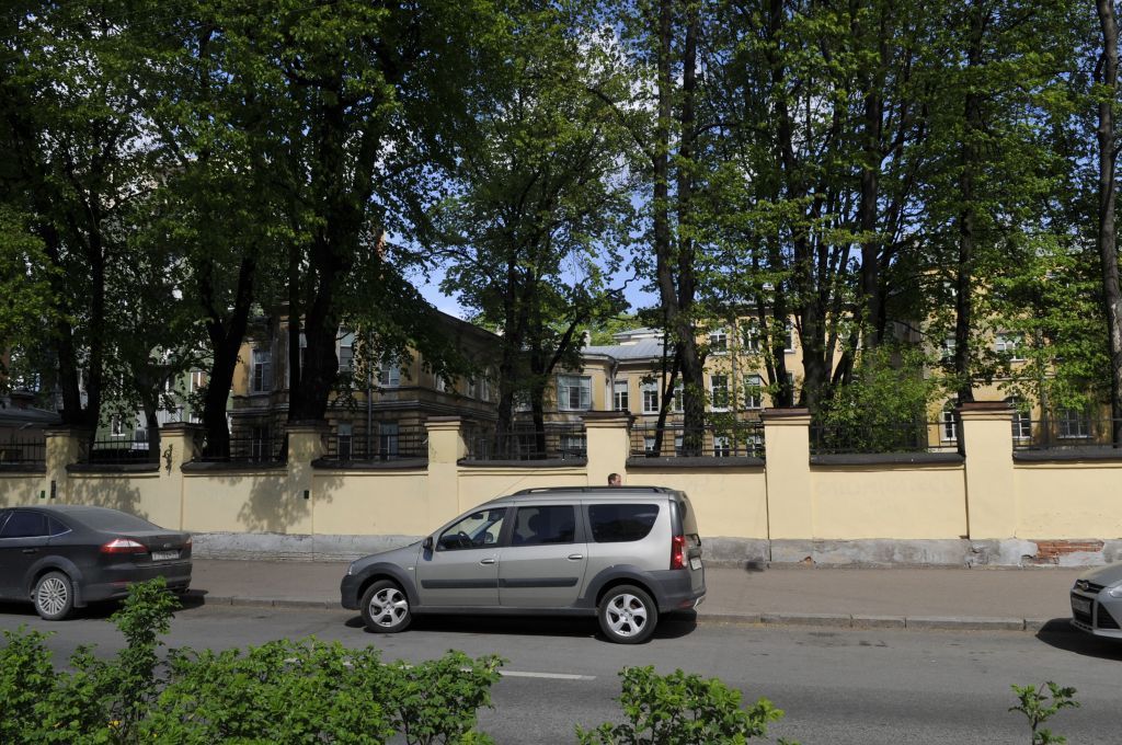 Ограда (14-я линия д. 57-61)Объёмно-пространственное решение:Местоположение, конфигурация ограды, расположенной вдоль 14 линии В.О;Конструктивная система:Исторический известняковый цоколь.Архитектурно-художественное решение:Историческое архитектурное решение ограды на известняковом цоколе с парапетными тумбами и кованым завершением;кованые металлические флагодержатели на 3 и 8 столбах.