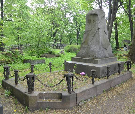 Объемно-пространственное и архитектурно-художественное решение:историческое местоположение захоронения, габариты и конфигурация надгробия; историческое художественное надгробие в виде высокой монолитной скалы серого кованого гранита на двухступенчатом основании полированного гранита, на невысокой площадке-подиуме, ограниченном поребриком розового кованого гранита с оградой в виде стилизованных кованых цепей на литых металлических стойках в виде стилизованных траурных урн, в верхней части монолита вырублен четырёхконечный крест высокого рельефа; рельефные символы, характер и содержание надгробных надписей. * металлодекор утрачен (ниже креста видны следы крепления от утраченного портретного медальона)