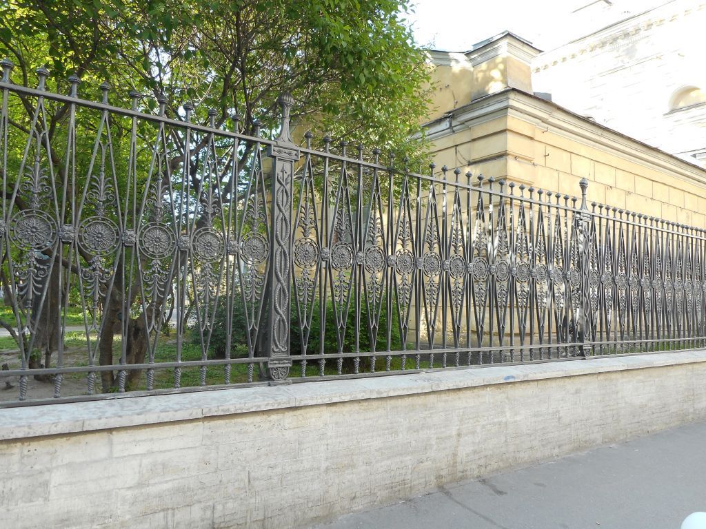 Местоположение (по красной линии улицы Декабристов, к западу и востоку от садового павильона), габариты, конфигурация ограды с воротами; материал, техника исполнения (цоколь – известняковая плита, звенья ограды и створы ворот – чугун, литье); конструктивное решение (звенья и створы и литых чугунных стойках в виде стилизованных мечей, с волютообразными кронштейнами); рисунок (модуль звена и створа ворот в виде ажурного, вытянутого по вертикали ромба с розеткой по центру, фланкированного пальметтами, завершение модулей фиалами); в нижней части створы ворот – глухие, обшиты листом черного металла с филенками.
