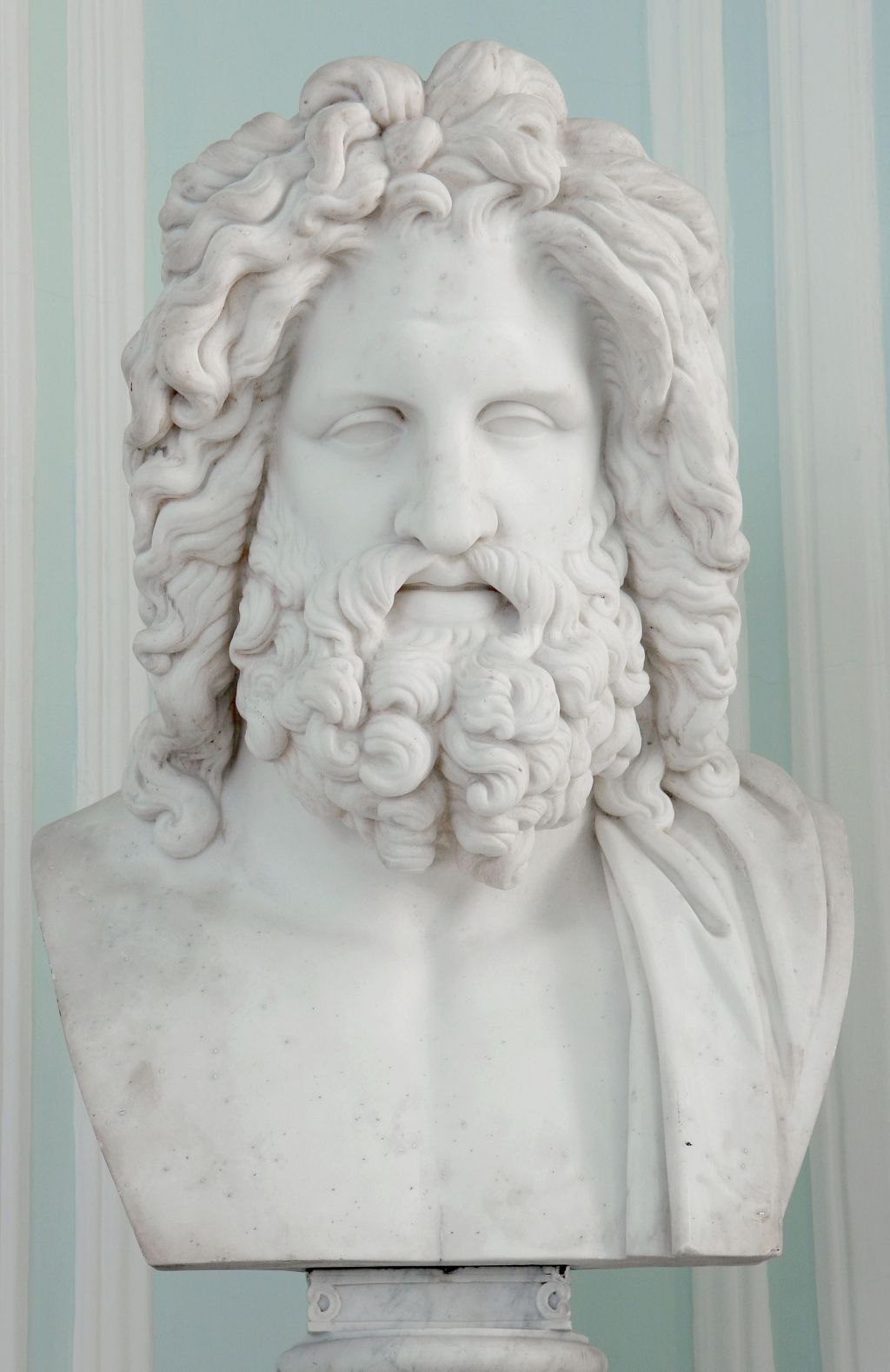 Объемно-пространственное и пластическое решение:погрудное изображение Зевса с переброшенной через плечо драпировкой; кон. XIX в.,белый мрамор.