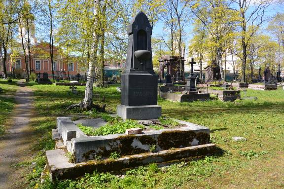 1. Могила Абрамовича В.М. (1887-1913), авиатора, 5-й-участок, 12-я дорожка 1.Объемно-пространственное и архитектурно-художественное решение:историческое местоположение, габариты и конфигурация участка (семейное место);захоронения в границах участка; надгробие в виде каплицы из тёмного гранита, на постаменте, внутри гранитного поребрика; характер и содержание надгробной надписи.