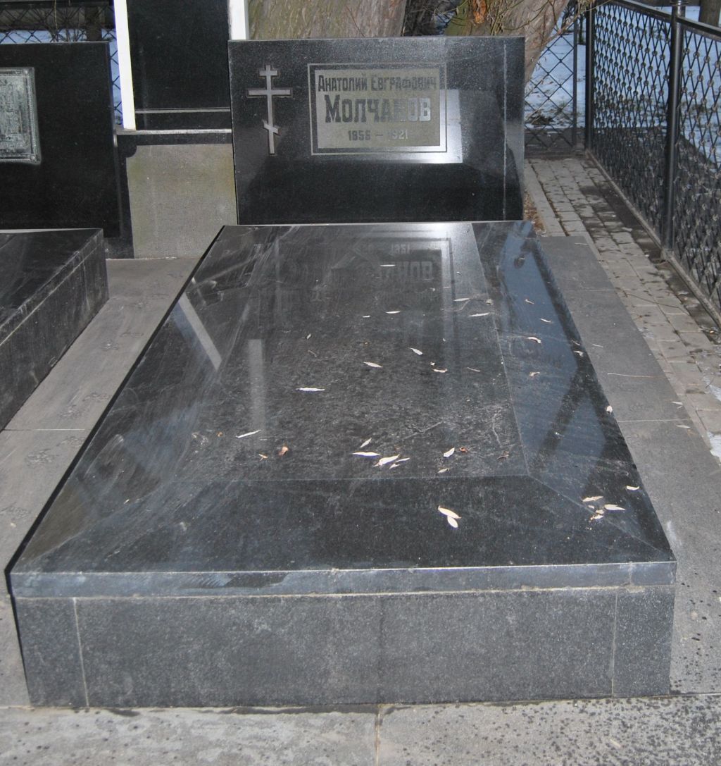 существующее* местоположение у северного фасада корпуса № 1 * историческое место захоронения – крипта корпуса № 1, прямоугольная надгробная плита черного мрамора на общем прямоугольном основании серого гранита, ее конфигурация и габариты; надпись на вертикальной плите черного мрамора «Анатолий Евграфович Молчанов 1856-1921» и изображение восьмиконечного креста.
