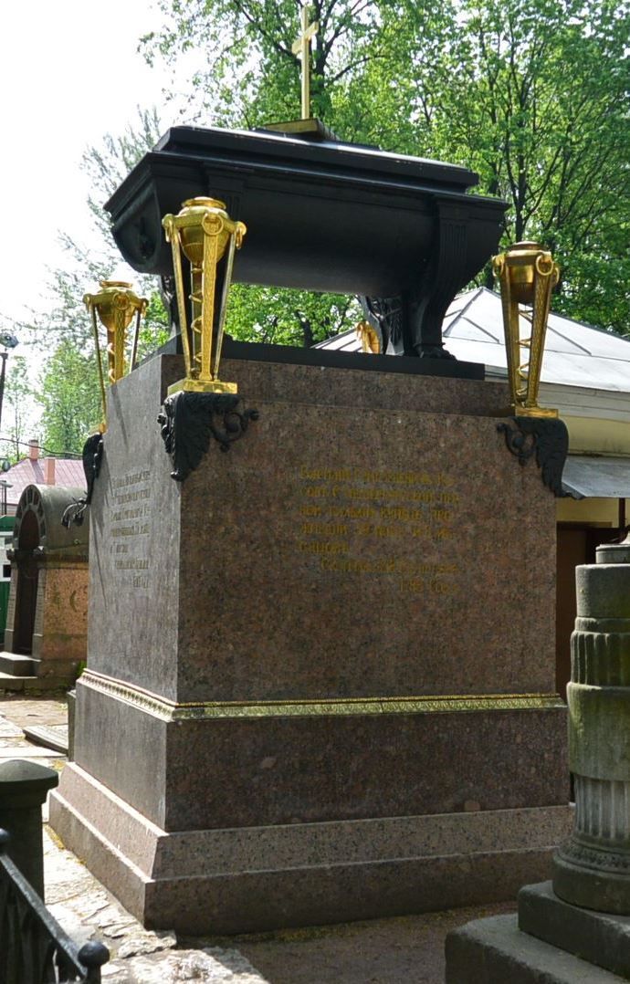 Объемно-пространственное и архитектурно-художественное решение: местоположение захоронения, габариты и конфигурация надгробия; авторское художественное решение надгробия: саркофаг литого металла на фигурных опорах, с завершением в виде креста, водруженного на лежащую на крышке книгу , на высоком гранитном постаменте, декорированном по углам металлическими курильницами и растительными мотивами; характер и содержание надгробной надписи.