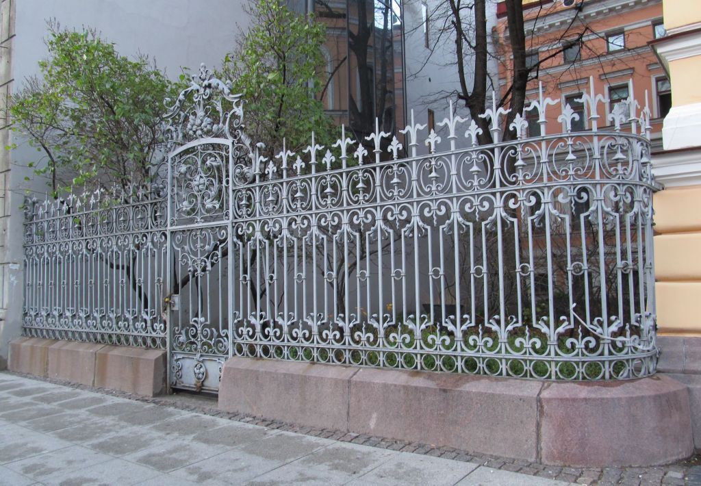 Объемно-пространственное решение:историческое местоположение, габариты, конфигурация ограды курдонера, ограды восточного двора.Архитектурно-художественное решение:вид материала отделки цоколя оград курдонера и восточного двора – плиты из полированного красного гранита со скошенным верхним краем;ограждение курдонера – габариты, конфигурация (решетка с закругленными углами), конструкция (решетка и калитка с фигурным навершием), вид материала (металл), техника исполнения (ковка), рисунок (пики с волютообразными завитками и стилизованными растительными элементами, пояс из кругов в нижней части, пояс из стилизованных рокайльных элементов в верхней части, нестворная часть калитки с композицией из растительного орнамента, навершие с цветами и растительными завитками);ограждение восточного двора – габариты, конфигурация (решетка с закругленным углом в западной части), конструкция (двустворные ворота на двух ажурных прямоугольных в плане столбах, одностворная калитка в восточной части; с глухими филенками в нижней части), вид материала (металл), техника исполнения (ковка), рисунок (пики с волютообразными завитками и стилизованными растительными элементами, пояс из кругов в нижней части, пояс из стилизованных рокайльных элементов в верхней части; накладной декор из цветочных розеток и завитков в филенках; волютообразные и растительные завитки в верхней части створок ворот; волютообразные завитки и растительные элементы столбов, растительные завитки и стилизованные пальметты в навершиях столбов; навершие над воротами с растительными завитками и вензелем «СН»);фонари – количество (два), местоположение (в завершении столбов ограды восточного двора), конструкция, конфигурация (квадратные в плане), вид материала (металл), техника исполнения (ковка), оформление (растительные элементы в основании и навершии, цветочные розетки).