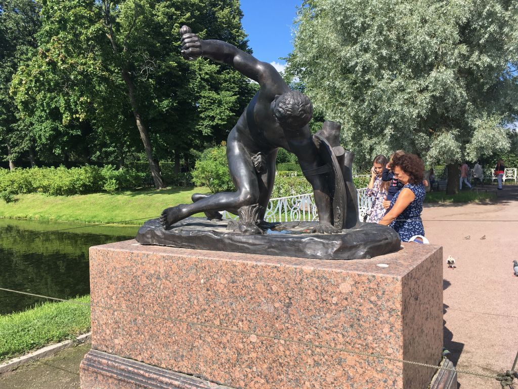 Объемно-пространственное и пластическое решение;гальваническая копия с эллинистической скульптуры обнаженного античного бойца со щитом на левой руке и рукояткой меча в правой; 1853 г., мастерская Гамбургера И. (с оригинала скульптора Эпигона), материал - медь, техника - гальванопластика.