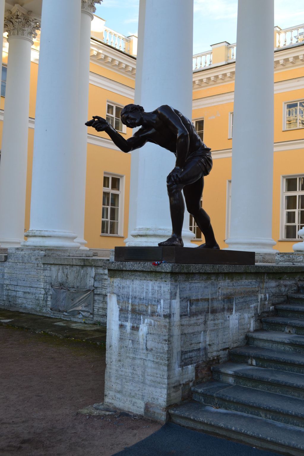 Объемно-пространственное и пластическое решение:круглая скульптура, изображающая юношу, играющего в бабки, в полный рост с вытянутой вперед правой рукой; прямоугольный гладкий плинт;надпись на плинте: \"Александровский Литейный Завод 1838\";местоположение на парапете центрального крыльца Александровского дворца;1835 г., 1838 г., скульптор С.С. Пименов