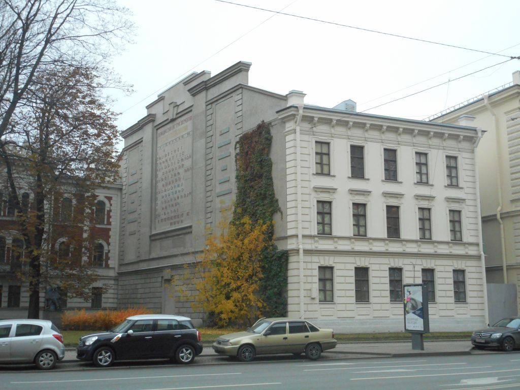 Объемно-пространственное решение: исторические габариты и конфигурация 3-х этажного здания;конфигурация и габариты крыши, материал окрытия (железо).Конструктивная система: исторические наружные и внутренние капитальные стены;исторические отметки междуэтажных перекрытий;исторические лестницы и лестничные клетки (2 шт.) – местоположение, конструкция: двухмаршевые, каменные по металлическим балкам, каменные ступени (вид ступеней – с валиком, нижние ступени с закруглением), каменная выстилка площадок, материал – путиловский известняк; ограждения лестниц: металлический прут.Объемно-планировочное решение: историческое объемно-планировочное решение в габаритах капитальных стен. Архитектурно-художественное решение фасадов: в стиле эклектики;лицевой фасад: на пять оконных осей, отделка (штукатурка), угловые русты на высоту здания;материал и характер отделки цоколя –известняковая скоба;материал и характер отделки фасада – окрашенная штукатурка (нижний этаж – гладкий прямоугольный руст; профилированные канавки,поле стен второго и третьего этажей – гладкая штукатурка);оконные проемы: местоположение, габариты, форма (прямоугольные), материал заполнения (дерево), тип (двустворные с расстекловкой на 5 стекол);1-й этаж оконные проемы заглублены, профилированные штукатурные наличники, подоконные ниши с филенкой, над проемами декоративные замки с гладким фасом;2-й этаж – профилированные наличники с «ушками» и выступом, подоконные элементы на консолях, линейные сандрики на лепных консолях;3-й этаж – профилированные наличники, линейные; подоконные элементы;междуэтажная тяга: между 1-м и 2-м этажами;фриз под карнизом;профилированный венчающий карниз на лепных консолях;угловые тумбы нам крыше: материал (кирпич), отделка (гладкая штукатурка);ворота: местоположение (между домами лит. Ж и лит. Б), форма (прямоугольные), заполнения (кованные металлически створки с калиткой);торцевые фасады (северные): гладкая штукатурка, гладкие угловые русты;боковой фасад (южный):материал и характер отделки цоколя – известняковая скоба;материал и характер отделки фасада – каменная штукатурка;нижний ярус – гладкий «кладочный» руст, портал ступенчатый, с замковым камнем;горизонтальная профилированная тяга в уровне между 1-м и 2-м этажами; верхний ярус – четырехчастная структура: гладкое поле, поле, выделенное гладкими рустами, центральное поле выделено лопатками, штукатурная профилированная рама с тройным декоративным замком); зеркало в виде цветного (красный и синий цвета) мозаичного панно «Периодическая система элементов Д. И. Менделеева»; по обеим сторонам от панно гладкие поля, в левом поле надпись:«Наука начинается с тех пор, как начинают измерять» (голубой цвет), подпись Менделеева (красный цвет)»;в правом поле: не установить;завершение стены – ступенчатый аттик;дворовые фасады:материал и характер отделки фасада – окрашенная гладкая штукатурка;междуэтажная профилированная тяга между 1 и 2 этажами;венчающий профилированный карниз.