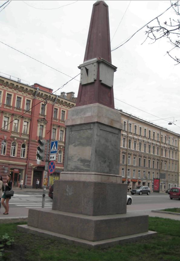 Объемно-пространственное решение:историческое местоположение, конфигурация, габариты;четырехгранный обелиск на трехступенчатом стилобате (гранит Северного Приладожья) на цоколе, цоцоль, состоящий из центрального куба (серый с прожилками рускеальский мрамор) на плинте (розовый тивдийский мрамор) и карнизной части (розовый тивдийский мрамор);над карнизной частью - обелиск с заостренным верхом (шокшинский кварцит) на квадратном основании (рускеальский мрамор);Конструктивная система и декоративно-художественное решение:материал столба (мрамор рускеальский, тивдийский; гранит Северного Приладожья; шокшинский кварцит, кирпич (основа));отвесные доски из белого мрамора с венчающими карнизиками;на восточной доске, обращенной к проезжей части, высечена надпись «от Царского села 22/2 от Москвы 673/2»на северной и южной мраморных досках циферблаты солнечных часов с римскими цифрами и металлическим косоугольным стержнем;