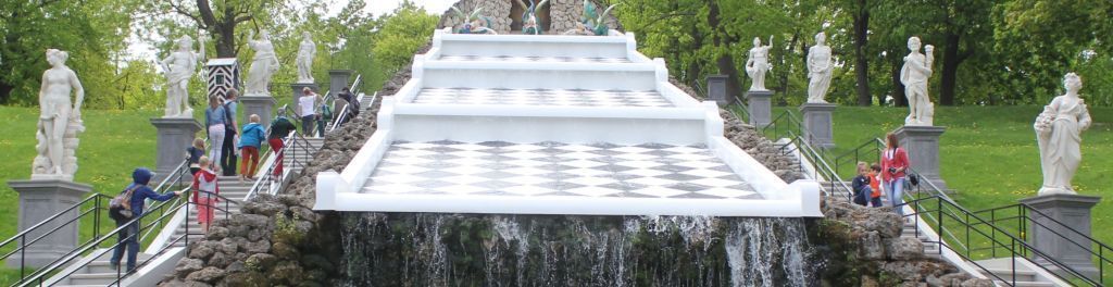 статуя «Вулкан»* на плинте (мрамор), установлена на каскаде Драконов с западной стороны (место 3 снизу); мужская фигура выполнена в полный рост; голова повернута к левому плечу, торс повернут влево, обеими руками у правого бедра держит пучок стрел, опирается на правую ногу, левая нога согнута в колене и опирается на шлем, драпировка со спины от левого плеча спадает вниз, закрывая бедра и закреплена на спине лямкой, перекинутой через левое плечо к драпировке, слева от фигуры наковальня с пламенем; основание неправильной формы;* оригинал находиться в интерьерах Большого петергофского дворца.пьедестал известняковый, квадратного сечения, с профилированными карнизом, базой и филенками по граням; техника: рубка, наковка; постамент – известняк;статуя «Юпитер»* на плинте (мрамор) – установлена на каскаде Драконов с восточной стороны (место 3 снизу); мужская фигура выполнена в полный рост; голова приподнята, волосы спадают на спину, перехвачены лентой, небольшая бородка, ладонью левой руки придерживает драпировку, перекинутую со спины через правое плечо на бедра, правая рука согнута в локте и поднята вверх, правая нога согнута в колене, опирается на шар, на котором изображены звезды, слева на сидит орел; основание неправильной формы;* оригинал находиться в интерьерах Большого петергофского дворца.пьедестал известняковый, квадратного сечения, с профилированными карнизом, базой и филенками по граням; техника: рубка, наковка; постамент – известняк;статуя «Жрица»* на плинте (мрамор) - установлена на каскаде Драконов с восточной стороны (место 1 снизу); женская фигура выполнена в полный рост; голова повернута к правому плечу, на голове венок, в левой руке, держит чашку, в правой согнутой в локте и поднятой вверх-палочку, левая нога, согнута в колене, одета в хитон с длинными рукавами, на ногах сандалии, у левой ноги на основании жертвенник с пламенем; основание неправильной формы, с неровно обработанной поверхностью;* оригинал находиться в интерьерах Большого петергофского дворца.пьедестал известняковый, квадратного сечения, с профилированными карнизом, базой и филенками по граням; техника: рубка, наковка; постамент – известняк;статуя «Нептун»* на плинте (мрамор) - установлена на каскаде Драконов с восточной стороны (место 5 снизу); мужская фигура выполнена в полный рост; голова наклонена к левому плечу, борода, длинные волнистые волосы, левой рукой держит за хвост дельфина, туловище которого поднято вверх и прижато к левой ноге; правой рукой придерживает драпировку на бедре, перекинутую через правое плечо, правая нога согнута в колене, опирается на шарообразный сосуд, из которого выливается вода, соединяясь с льющейся из пасти дельфина; основание неправильной формы;* оригинал находиться в интерьерах Большого петергофского дворца.пьедестал известняковый, квадратного сечения, с профилированными карнизом, базой и филенками по граням; техника: рубка, наковка; постамент – известняк;статуя «Флора»* на плинте (мрамор) - установлена на каскаде Драконов с восточной стороны (место 4 снизу); женская фигура выполнена в полный рост; голова повернута к правому плечу, волосы собраны на затылке, на голове венок из цветов, торс откинут назад, левая рука, согнутая в локте, поднята вверх, ладонью правой руки опущенной вниз, придерживает цветы из рога изобилия, лев