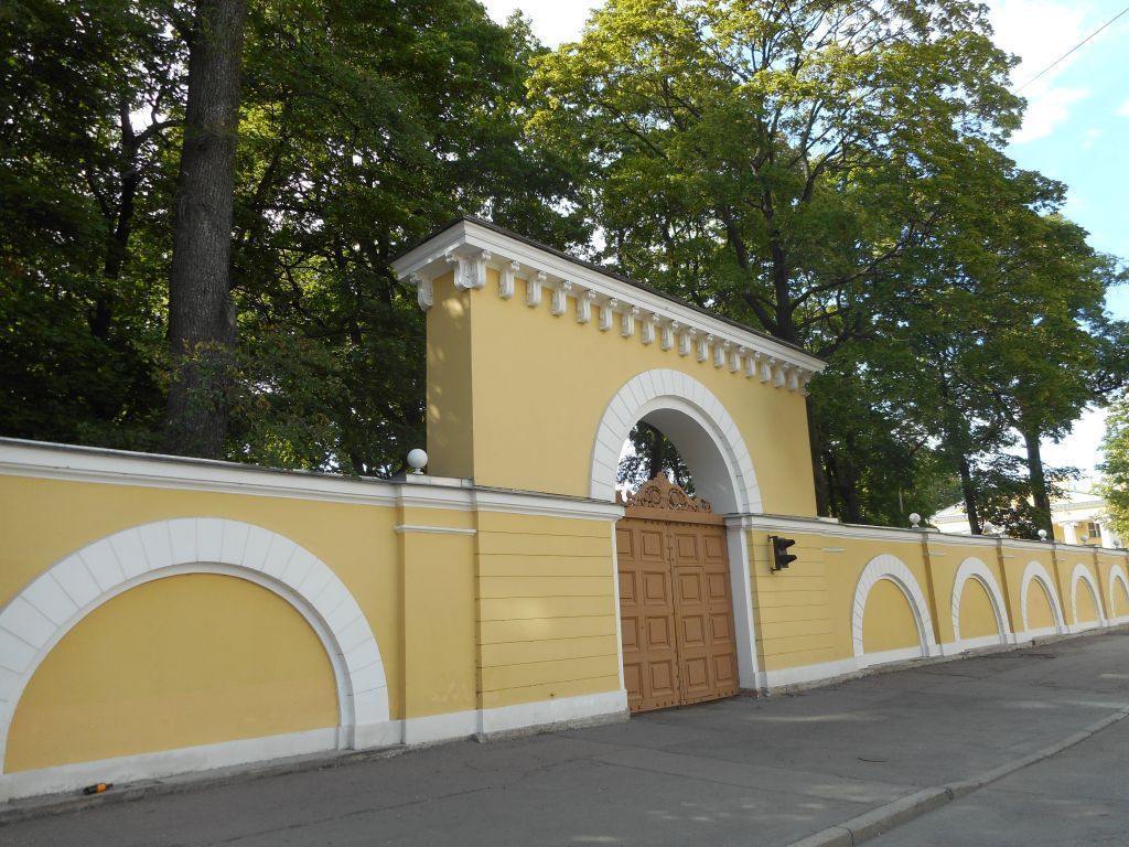 Объемно-пространственное решение:габариты и конфигурация разновысокой кирпичной, оштукатуренной ограды, с известняковым цоколем, оформляющей северную часть восточной границы участка - вдоль Таврической улицы.Архитектурно-художественное решение:ограда выполнена в виде глухой стены, ритмически организованной пилястрами дорического ордера в простенках - трехцентровые ниши в рустованных архивольтах;ворота, рустованные в нижней части, завершенные профилированным карнизом значительного выноса на лепных волютообразных кронштейнах; проемы с полуциркульными перемычками оформлены рустованными архивольтами, опирающимися профилированные импосты; заполнение воротных проемов: деревянные глухие двустворчатые филенчатые ворота, в верхней части декорированные фигурными ажурными резными композициями.