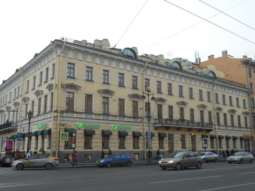 Объемно-пространственное решение: исторические габариты иконфигурация квадратного вплане здания до венчающего карниза:воротный проезд -местоположение (по б-й световой оси по Казанской ул.). конфигурация (прямоугольный), габариты: лестничный ризалит -местоположение (дворовыйфасад корпуса по Невскому пр.)- конфигурация(прямоугольный), габариты.Конструктивная система здания: исторические наружные и внутренние кирпичные капитальные стены;междуэтажные перекрытия – местоположение;своды – тип:пологие (площадки лестницы Л-2, Л-3);лестницы вестибюля – местоположение (по 5-й и 7-й световым осям по Казанской ул.), конфигурация, габариты;** ступени облицованы полированным натуральным камнем при реконструкции 1990-х гг.лестница – местоположение (помещения III,IV,V), конструкция (на косоурах), тип (трехмаршевая), габариты, материал ступеней (известняк);ограждение лестницы – материал (металл), рисунок (вертикальные стойки с растительным орнаментом);поручни – материал (дерево), конструкция (профиль);лестница – местоположение (Л-2), конструкция (на косоурах), тип (двухмаршевая), габариты, материал ступеней (известняк);ограждение лестницы – материал (металл), рисунок (вертикальные стойки с растительным орнаментом);поручни – материал (дерево), конструкция (профиль);лестница – местоположение (Л-3), конструкция (на косоурах), тип (трех маршевая), габариты, материал ступеней (известняк);ограждение лестницы – материал (металл), рисунок (вертикальные стойки с растительным орнаментом);поручни – материал (дерево), конструкция (профиль);лестница вестибюля – местоположение (по 8-й световой оси по Невскому пр.), конфигурация, габариты; ** ступени облицованы полированным натуральным камнем при реконструкции 1990-х гг.лестница вестибюля – местоположение (по 17-й световой оси по Невскому пр.), конфигурация, габариты.** ступени облицованы керамической плиткой при реконструкции 1990-х гг.Объемно-планировочноерешение: историческое объемно-планировочное решение в габаритах капитальных стен.Архитектурно-художественное решение фасадов: фасад по Казанской ул.: материал отделки цоколя – серый гранит;материал и характер отделки фасада – гладкая штукатурка, ленточный руст в уровне 1-го этажа;оформление воротного проезда – полуциркульная ниша, полуциркульная остекленная фрамуга, гладкий наличник, замковые камни;балкон на 8-ми гранитных кронштейнах – местоположение (по 4-8-й световой оси, в уровне 2-го этажа), конфигурация (прямоугольный), габариты;ограждение балкон – материал (металл), рисунок (вертикальные стойки с растительным орнаментом и балясинами в виде колонок с капителью и пьедесталом);дверные балконные проемы – местоположение (по 4-й, 8-й световым осям в уровне 2-го этажа), конфигурация (прямоугольный), габариты;оформление дверного балконного проема – профилированные наличники, треугольные сандрики на декоративных каннелированных кронштейнах с волютообразным и растительным рисунком;заполнение дверного балконного проема – рисунок расстекловки;дверные проемы – количество (два), местоположение (по 5-й и 7-й световым осям), конфигурация (прямоугольные), габариты;заполнение дверных проемов – материал (дерево), конструкция (двухпольные, полусветлые, с прямоугольный остекленной фрамугой), оформление (фигурные филенки, с драпировками в верхней части дверного полотна, профи