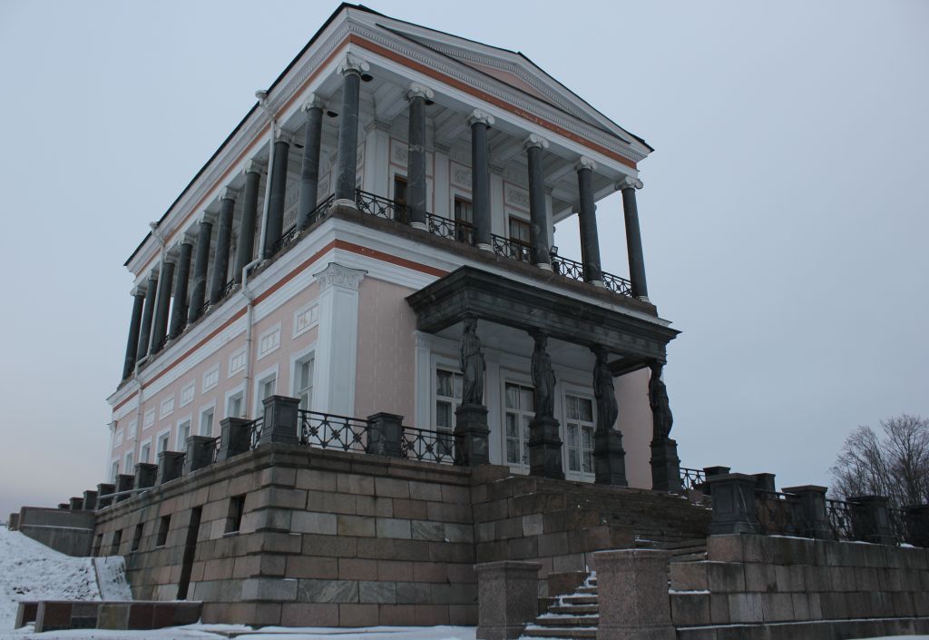 Объемно-пространственное решение:историческое объемно-пространственное решение здания, представляющее собой установленный на высоком гранитном стилобате двухэтажный прямоугольный объем*; * садовые перголы, примыкавшие к фасадам, утрачены в 1941-1944гг.второй этаж решен как открытый периптер, опоясанный колоннадой из 28 колонн сердобольского гранита;историческое местоположение здания на склоне Бабигонского холма, включая исторические отметки стилобата; отмостка по периметру здания – исторические материалы и отметки;исторические высотные отметки, конфигурация и габариты крыши основного объема здания.Конструктивная система: исторические наружные и внутренние капитальные кирпичные стены; кирпичные оштукатуренные надподвальные своды – полуциркульные с распалубками, на подпружных арках;историческая лестница с террасой со стороны северо-восточного фасада с прямоугольными гранитными тумбами – местоположение (спускается от портика), конфигурация, тип (маршевая, расходящаяся ниже 2-мя маршами, с опорными ступенчатыми стенками), ограждение террасы* (материал – металл), рисунок (секции из пересекающихся между собой пик с розеттой в центральной части и листьями аканта, прямоугольные гранитные тумбы под вазы); * историческое ограждение утрачено в 1941-1945 гг., существующее выполнено в 1950-х гг.;лестница* – местоположение (помещения 1-Н (1), 2-Н (1), тип (двухмаршевая), конструкция (чугун: косоуры, каннелированые столбы, ажурные подступеньки), габариты, материал (чугун, дерево);ограждение лестницы – материал (чугун), рисунок (литые вертикальные стойки с ажурным рисунком в нижней части из пальметт и цветущего аканта);* утрачено в 1941-1945 гг., существующее выполнено в 1950-х гг.;историческая винтовая лестница с каменными (известняк) ступенями – местоположение, конструкция, габариты; круглый в сечении поручень с держателями, консольно заведенными в стену;кессонированое перекрытие портика и открытой галереи 2-го этажа;гранитные колонны по периметру 2-го этажа;гранитные кариатиды портика северо-восточного фасада;мраморные колонны коринфского ордера парадного зала (помещение 1-Н (5);Объемно-планировочное решение:историческое объемно-планировочное решение парадных залов (помещения 1-Н (5), 2-Н (2).Архитектурно-художественное решение фасадов:архитектурно-художественное решение фасадов в приемах историзма:материал и характер отделки высокого цокольного этажа – выполнен в виде стилобата, облицован гранитом, по углам квадровый руст;материал и характер обработки фасадной поверхности – гладкая окрашенная штукатурка под «греческий» руст;открытая терраса с крыльцами (северо-западный, юго-восточный фасады), ограждением и прямоугольными гранитными тумбами под вазы (оформлены прямоугольными филенками из профилированных тяг; верхняя часть тумб профилированная) в уровне 1-го этажа – местоположение (по периметру всего здания), конфигурация, габариты, покрытие пола террасы и ограждение* (материал – металл, рисунок – секции из пересекающихся между собой пик с розеттой в центральной части и листьями аканта); * историческое покрытие пола террасы утрачено; историческое ограждение утрачено в 1941-1945 гг., существующее выполнено в 1950-х гг.;крыльцо с террасой – местоположение (южно-восточная сторона фасада), конфигурация, тип (маршевая), габариты, материал (гранит), ог