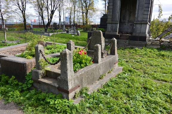 Могила Костычева П.А. (1845-1895), почвоведа, 5-й участок, 10-я дорожка1.Объемно-пространственное и архитектурно-художественное решение:историческое местоположение, габариты и конфигурация участка (семейное место); захоронения в границах участка; надгробие в виде стелы рваного камня на постаменте, внутри семейного захоронения, в виде массивного гранитного поребрика с металлическим ограждением из цепей, закреплённых на массивных гранитных пилонах; характер и содержание надгробной надписи.