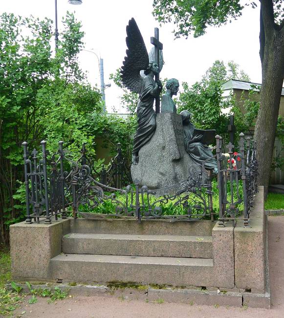 Объемно-пространственное и архитектурно-художественное решение:историческое местоположение захоронения и конфигурация надгробия; авторское художественное решение надгробия виде скульптурной композиции, состоящей из портретного бронзового бюста на гранитном пьедестале-скале и двух бронзовых фигур ангелов с символическими аксессуарами (крест и книга-партитура), скульптурная композиция расположена на высоком подиуме из красного гранита со ступенями и металлической кованой оградой сложного рисунка (фигурные стойки и прутья, декорированные стилизованными волютами и элементами растительного характера); рельефные символы, характер и содержание надгробных надписей.