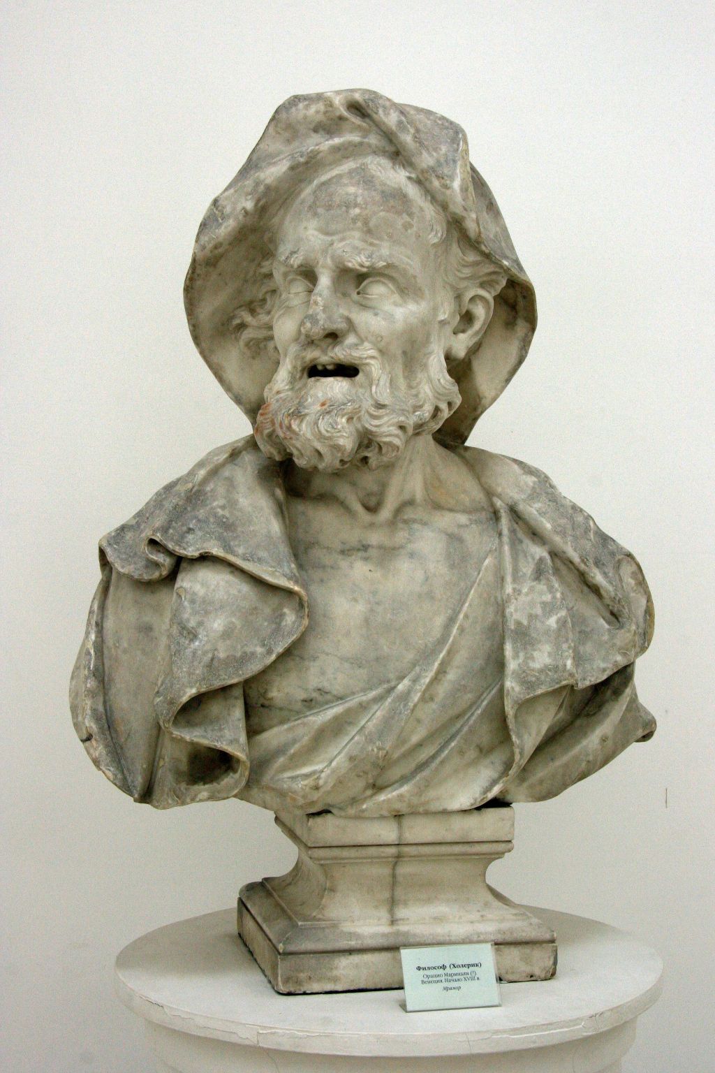 Объемно-пространственное и пластическое решение; погрудное изображение мужчины с бородой, в широкополой шляпе, голова повернута к правому плечу, аллегория сангвиника; ножка прямоугольная в сечении с профилировками; начало XVIII в., белый мрамор.